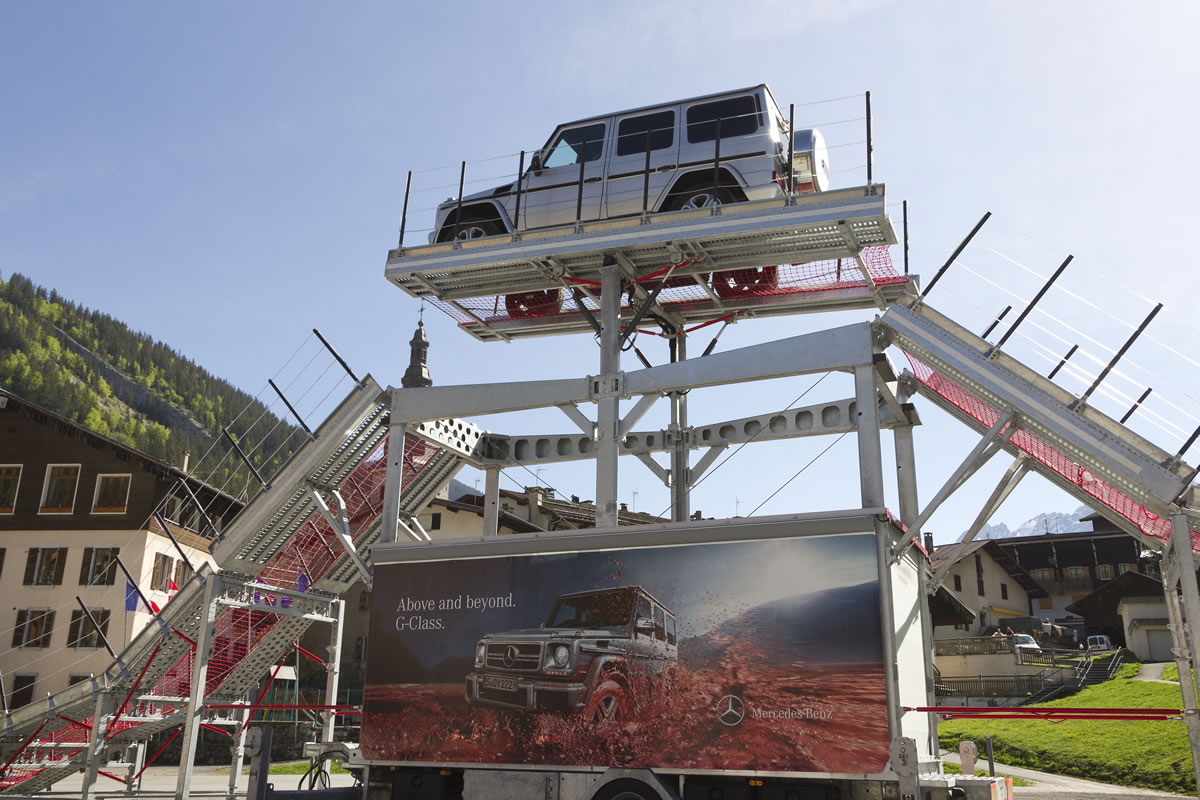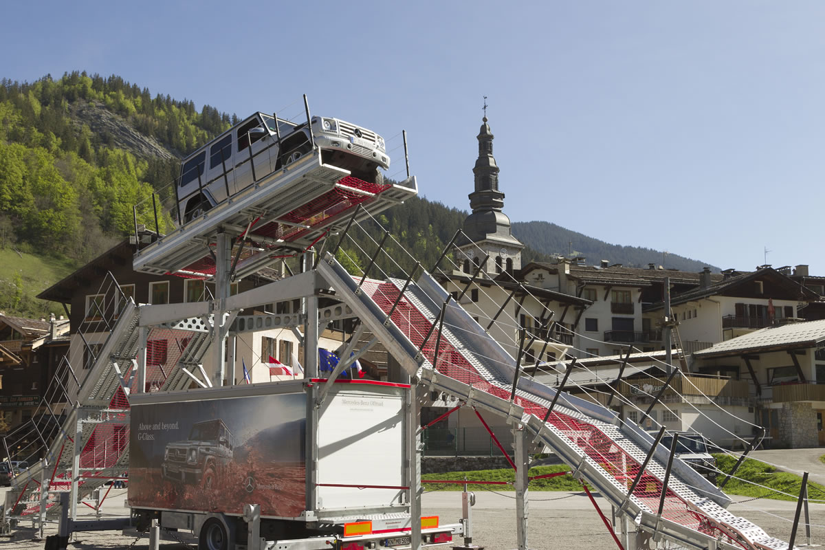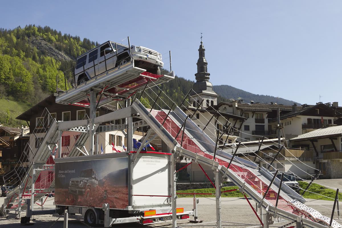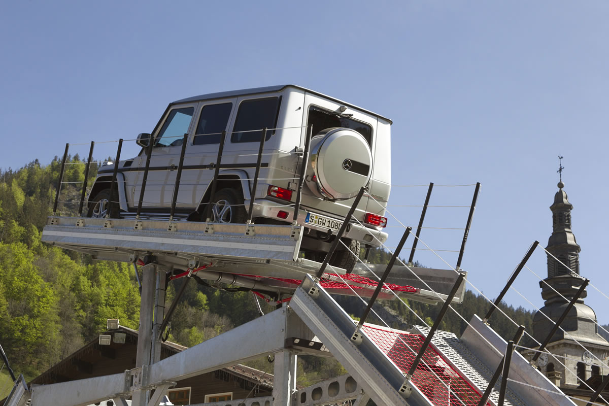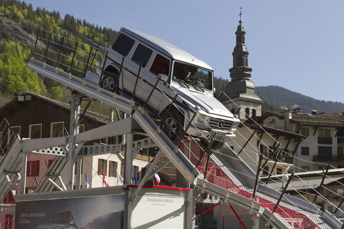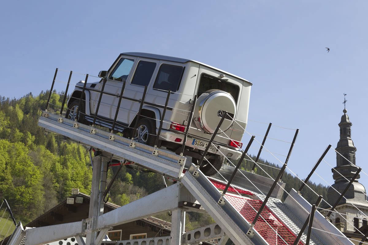 Enter “The Iron Schöckl”. Named after the Schöckl, a mountain near the Graz plant in Austria where the Mercedes G-Class is tested year round, the man-made Iron Schöckl challenges the Mercedes G-Class by forcing it to undertake a 100% climb (i.e., a 45 degree incline). Then, at the top, the G-Class enters a movable platform, teeters to point downward, and undertakes a 45 degree descent.
