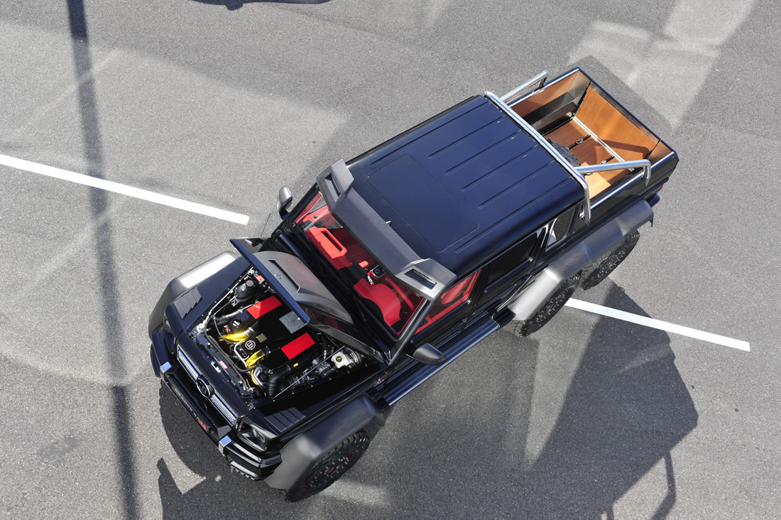 BRABUS also gives the 6×6 a strategic visual upgrade. The imposing nature of the front is further strengthened by purposeful modifications. The BRABUS front spoiler edges attach to the production fascia and are combined with an additional molding below the special radiator grille with integrated BRABUS logo. The BRABUS carbon-fiber hood scoop adds another striking highlight. The mirror-polished BRABUS underride guard provides an interesting contrast to the all-black paintwork.