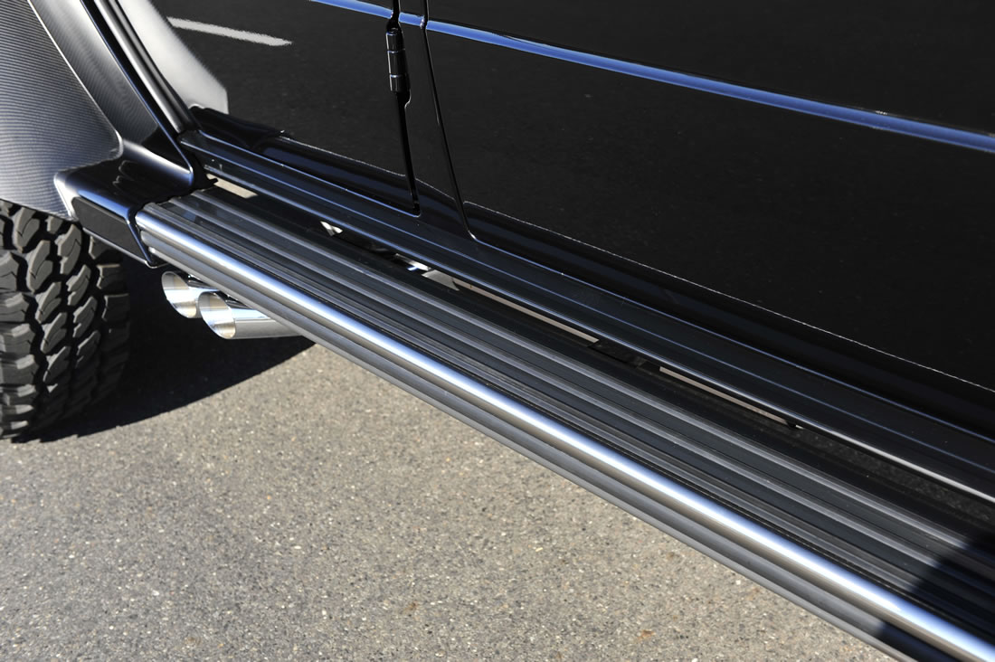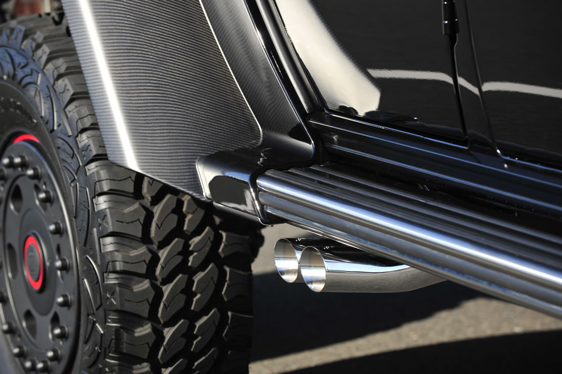 In addition, special high-performance metal catalysts with 75-mm (2.9 in.) downpipes are installed to lower the back pressure. The stainless-steel sport exhaust system with controlled butterfly valve was custom-developed for the G 63 6×6 AMG and offers both optimized power yield and active control of the exhaust note. Drivers can select at the push of a button between the subtle “Coming Home” mode and a markedly potent exhaust note in the “Sport” position. The BRABUS exhaust system also puts its visual stamp on both sides of the vehicles with two striking dual sidepipes.