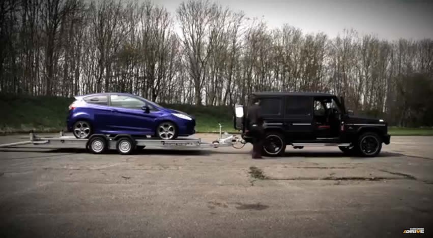 Drive Network’s Chris Harris was recently presented with an interesting challenge – make the Ford Fiesta ST accelerate faster than it’s normal 6.7 second 0-60 mph sprint without touching the motor. His plan: tow the mini Ford 1.6-liter EcoBoost (rated at 182 HP) with the massively powerful twin-turbo V8 5.5-liter 544 HP Mercedes G63 AMG, hoping the G63’s power would be enough to outdo the Fiesta, even with the Fiesta in tow.