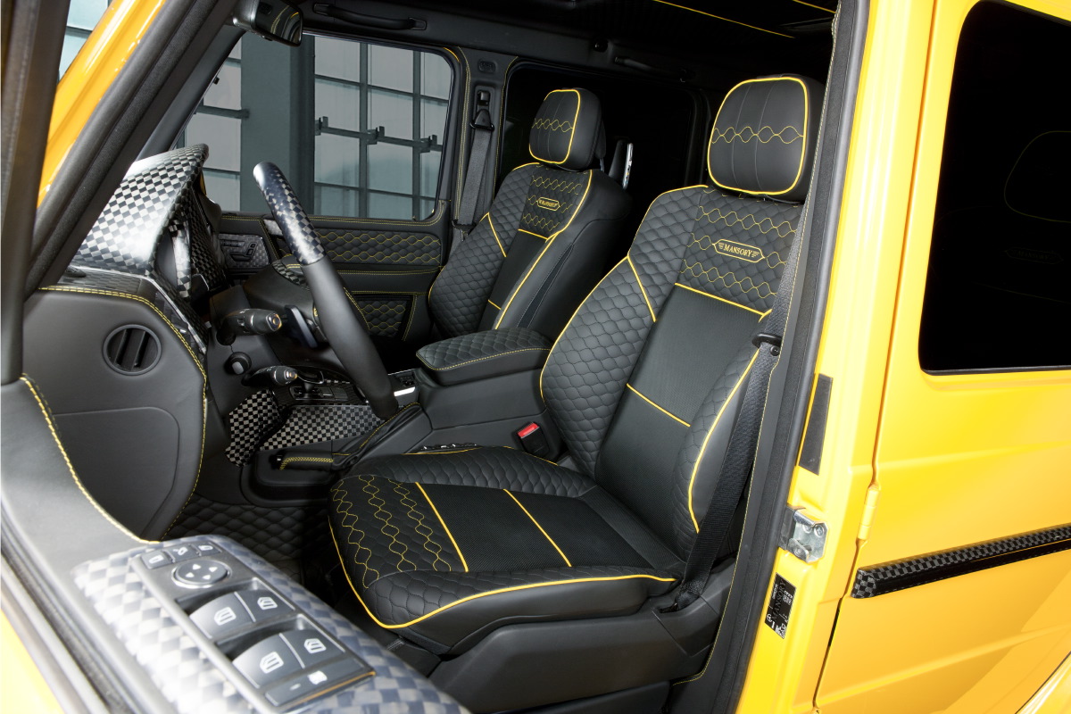 The continuation of these can be found in the interior. Both the dashboard as well as the entire area of the centre console has been completely re-designed. The in-house upholstery has, in collaboration with the design department, implemented a carbon design with coloured elements, which extends the concept of the exterior into the interior. The team has once again shown that at MANSORY only the best pristine leather of the highest grade, error-free fine woods, and of course, only perfectly produced carbon fibre will be worked with.