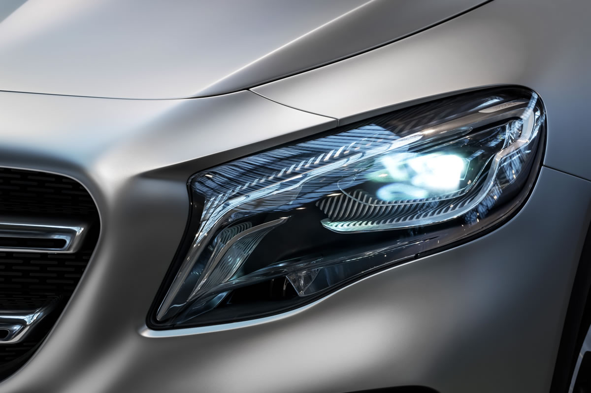 Film time! The front headlamps of the Concept GLA are each fitted with a laser-beam projector. These not only provide the light to drive by, but are also capable of projecting pictures or films onto a screen or other surface. Any format that can be operated through COMAND Online can serve as a source: pictures or films from a smartphone, the internet, or from a hard drive.