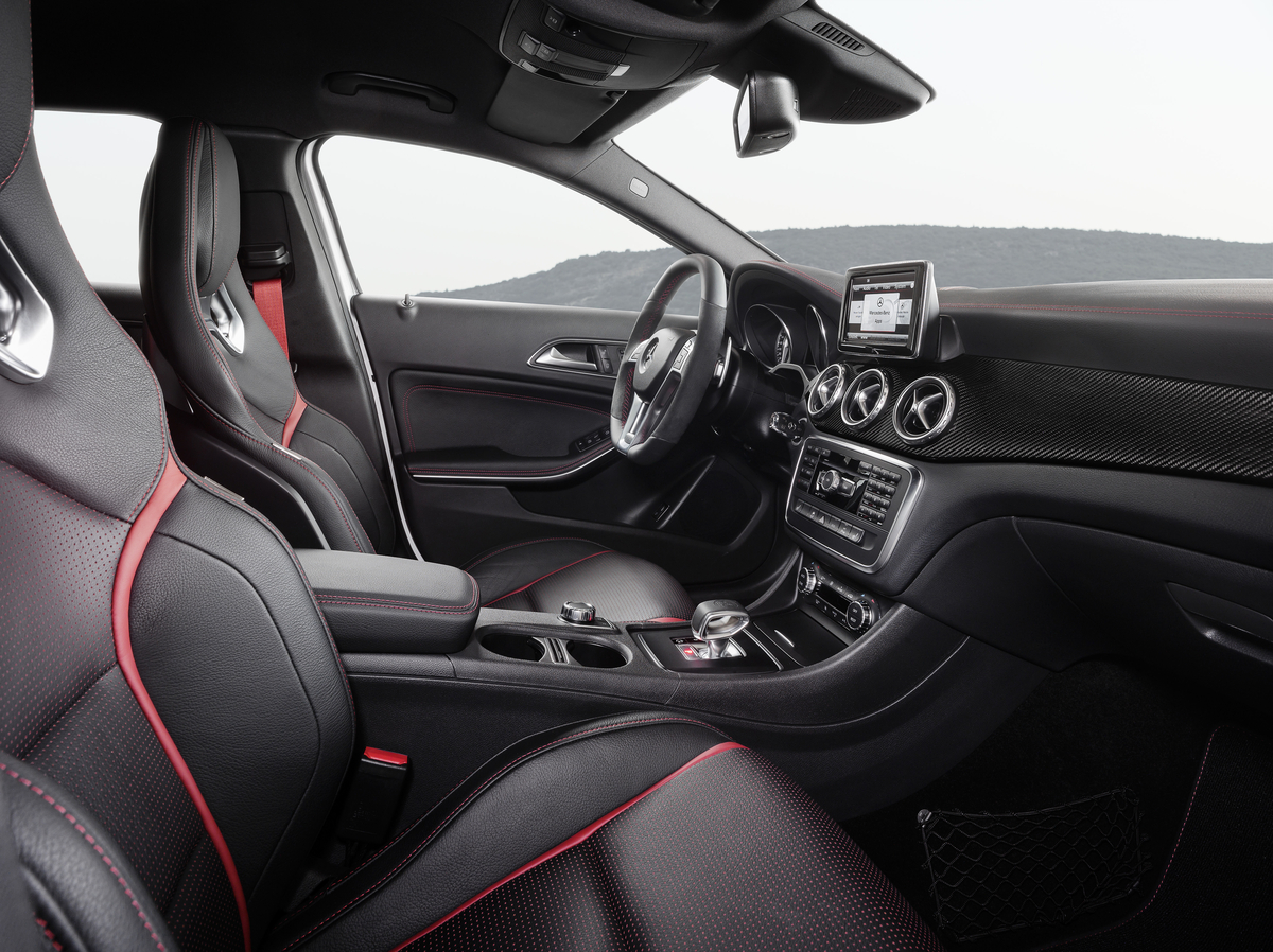 As in all AMG high-performance automobiles, the interior of the GLA45 AMG delights with its high-quality appeal combined with sporty flair and exclusive equipment features. These include sports seats upholstered with MB-Tex man- made leather/DINAMICA microfiber with red contrasting topstitching and red designo safety belts as well as the AMG DRIVE UNIT. The 3-spoke nappa leather multifunction sports steering wheel with red contrasting topstitching, perforated leather in the grip area and steering-wheel shift paddles ensures perfect vehicle control. The AMG instrument cluster with 2-tube design and central color display, AMG main menu and RACETIMER is on hand to keep the driver up to date. On opening the door, the driver is greeted by the AMG start- up screen. The trim of the instrument panel is made from brushed aluminum and, in tandem with the brushed stainless-steel AMG front door sills, emphasizes the high-grade, exclusive ambiance inside the GLA45 AMG.
