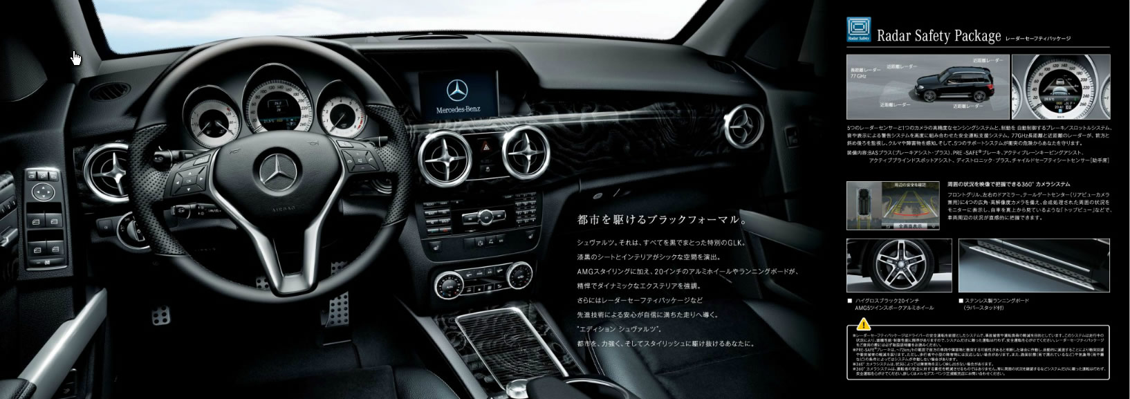 As for what you can expect from the GLK350 Schwarz Edition, highlights include glossy obsidian exterior paint, 20-inch AMG 5 twin-spoke aluminum wheels (with obsidian highlights to match the exterior), and an interior clad in Artico leather and black ash wood trim. Other unique elements include a radar safety package with brake assist, stainless steel foot pedals and foot boards, and a driver’s seat memory package to store seat settings.