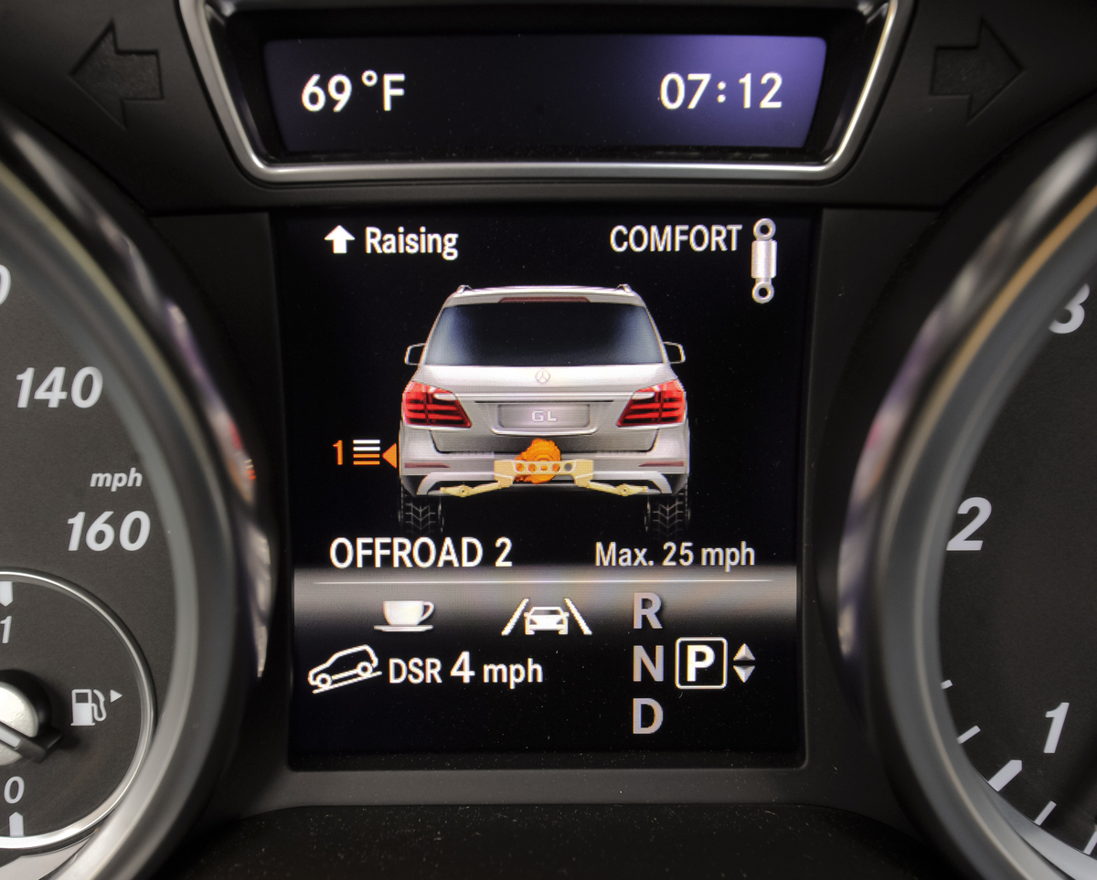 Engineers have worked hard to mask the machine’s mass, but outstanding acceleration aside, the seven-passenger behemoth feels heavy from behind the wheel. Each GL comes standard with the Mercedes-Benz Airmatic air ride suspension, which does an excellent job of mitigating body roll and soaking up imperfections in the road surface. Our test route took us down a heavily washboarded dirt road, and the GL450 absorbed the worst of the undulations at speeds up to 50 mph. The design also allows the driver to select a ride height for any given situation, and the optional $2,800 off-road package lets the Airmatic system increase ground clearance by a staggering four inches. Expect to find additional skid plates and two locking differentials as part of the kit.