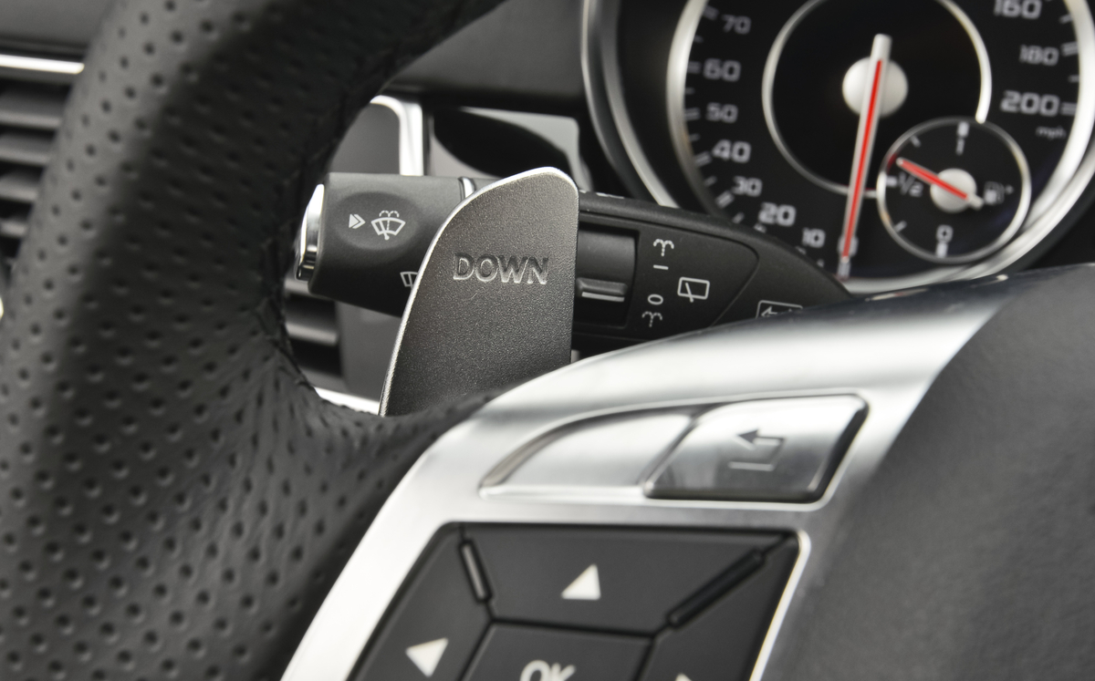 The AMG performance steering wheel features a four-spoke design and offers optimum vehicle control with perforated leather grips, a flattened bottom and aluminum shift paddles. Four instrument dials in the AMG instrument cluster provide the driver with all necessary information. Positioned in the center is a color TFT monitor, which incorporates an AMG logo and the AMG main menu.