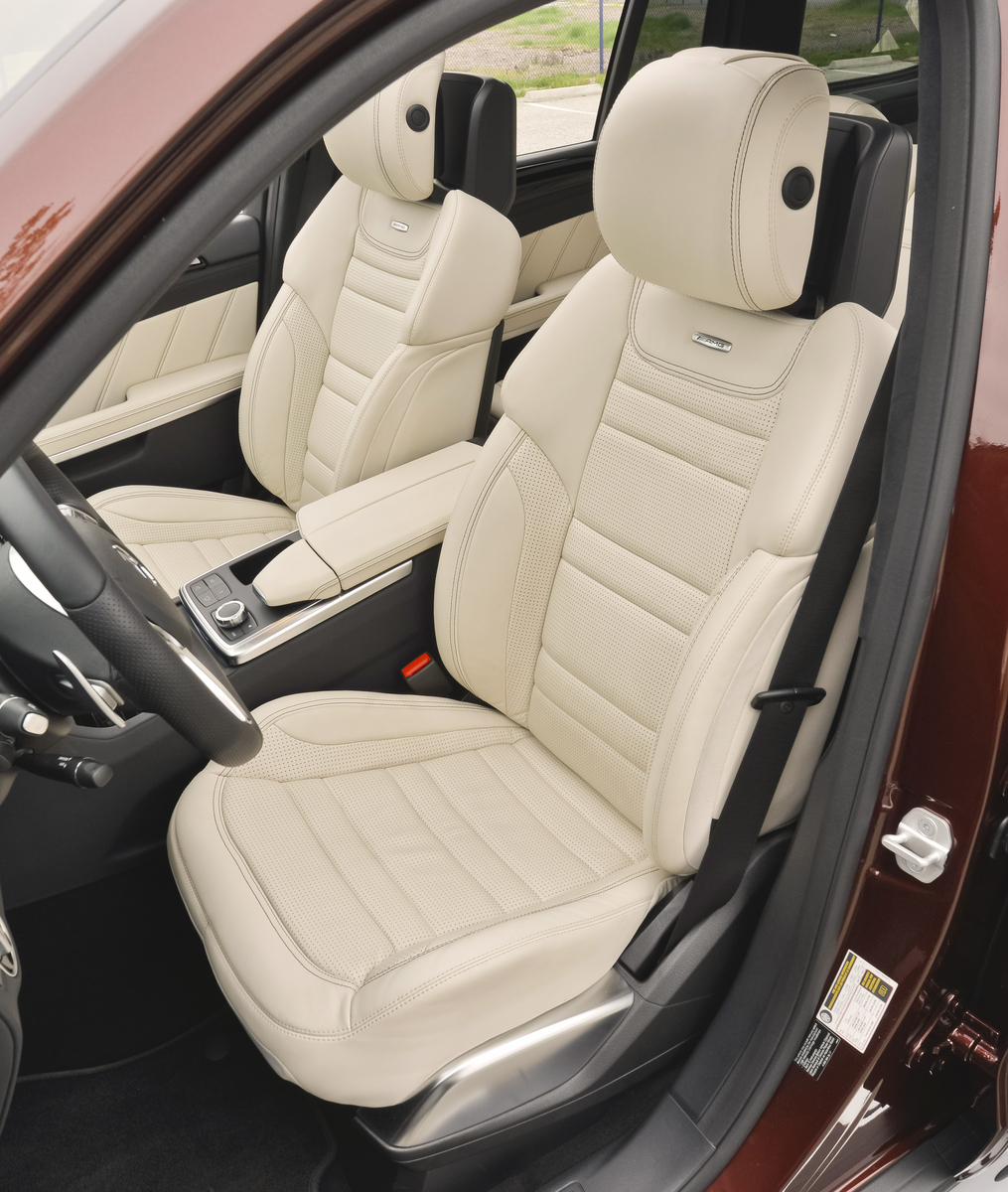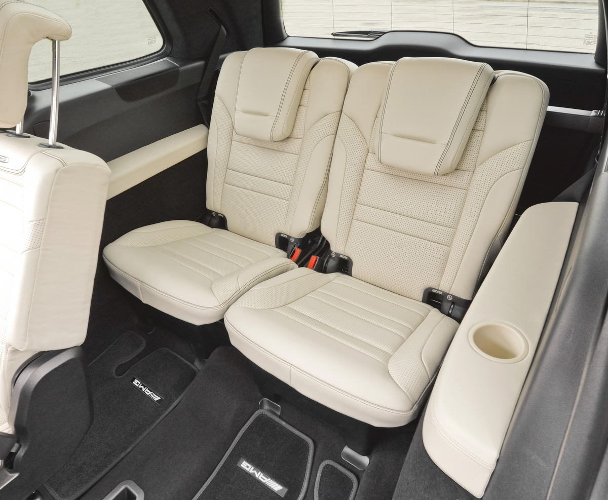 Enormous attention to detail, perfect ergonomics and a generous amount of space characterize the interior of the GL63 AMG, where the emphasis is on exclusivity and dynamics. All seven seats in the high-performance SUV are upholstered in premium leather. The electrically adjustable AMG sports seats feature double stitching in a contrasting color, as well as AMG badges in the backrests of the front seats and the outer rear seats. The dashboard, armrests and door trim are finished in MB-Tex with double stitching.