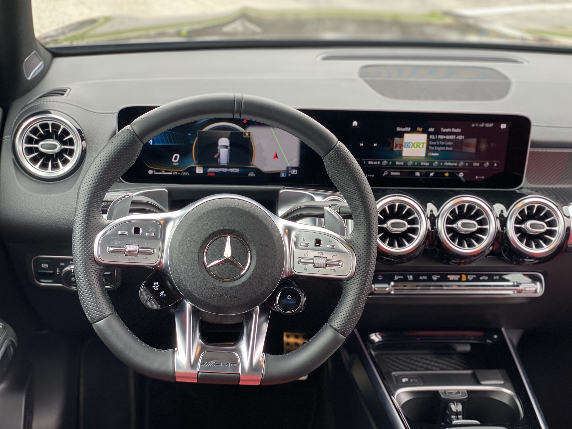 I recently spent a week with an AMG GLB35 to find out how an SUV of all trades fits in. The tester came upgraded with 20-inch black alloy wheels instead of 19s ($1,050) with four-piston silver AMG brake calipers glinting through. With the Cosmos black metallic coat ($720), the GLB35 looked like a pit bull, striking in its muscularity and with a foreboding presence, despite its small stature.