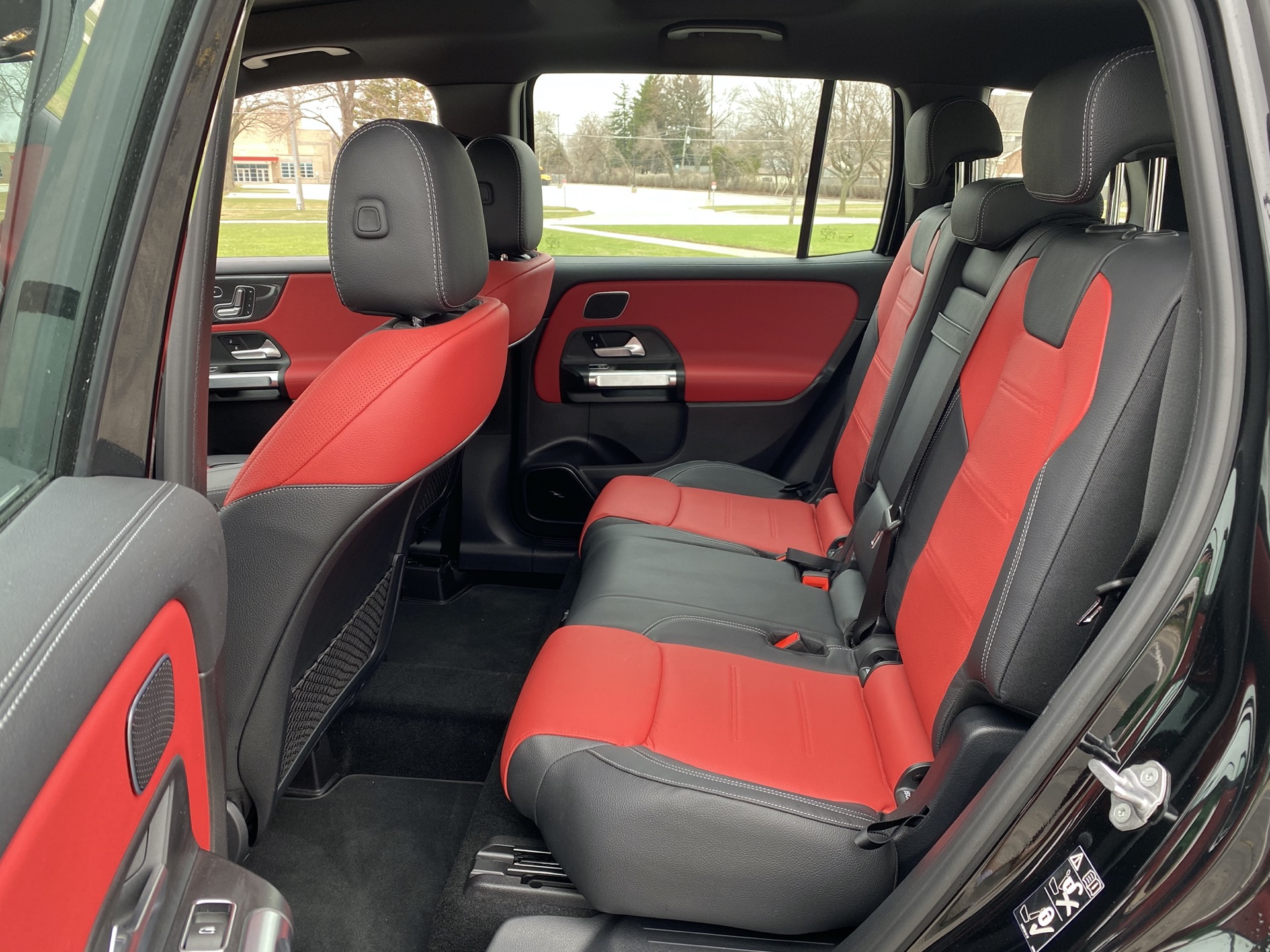 For the three of us, the GLB35 had plenty of room for a three-day weekend. The reclining 60/40-split rear seats slid 5 inches and helped mitigate complaints when the front passenger reclined her seat. With the rear seats moved all the way back, we fit three carry ons, a small cooler, and two backpacks in the cargo area, and concealed it all with the cargo cover. It specs out to 22 cubic feet, or 62 cubes with the seats folded down. For taller humans, head room is great due to the boxed roof, but stacking two 6-footers front to back could set front and rear occupants against each other as they jockey for space.