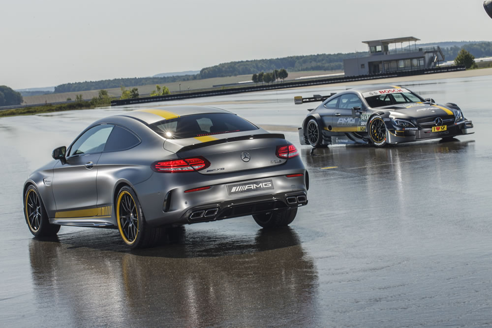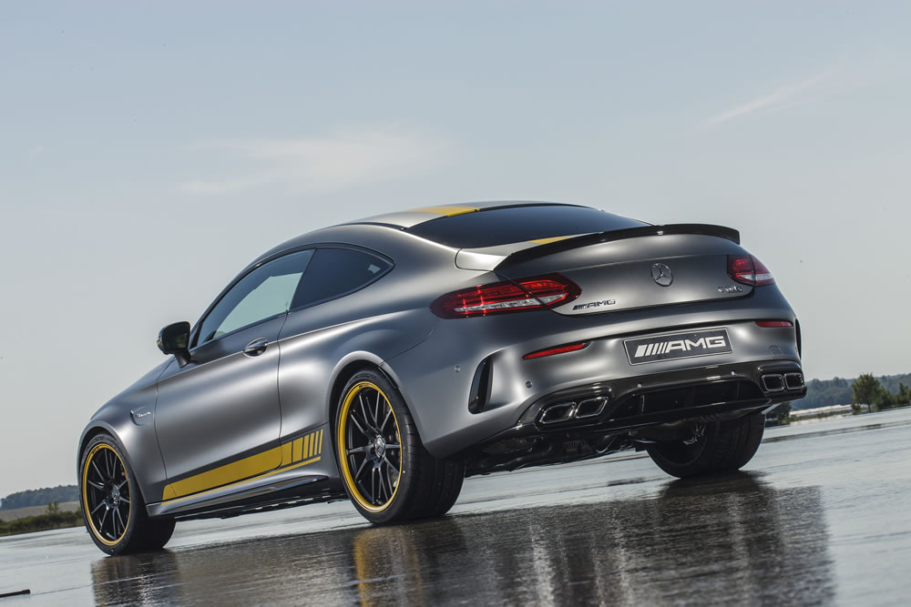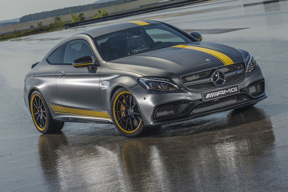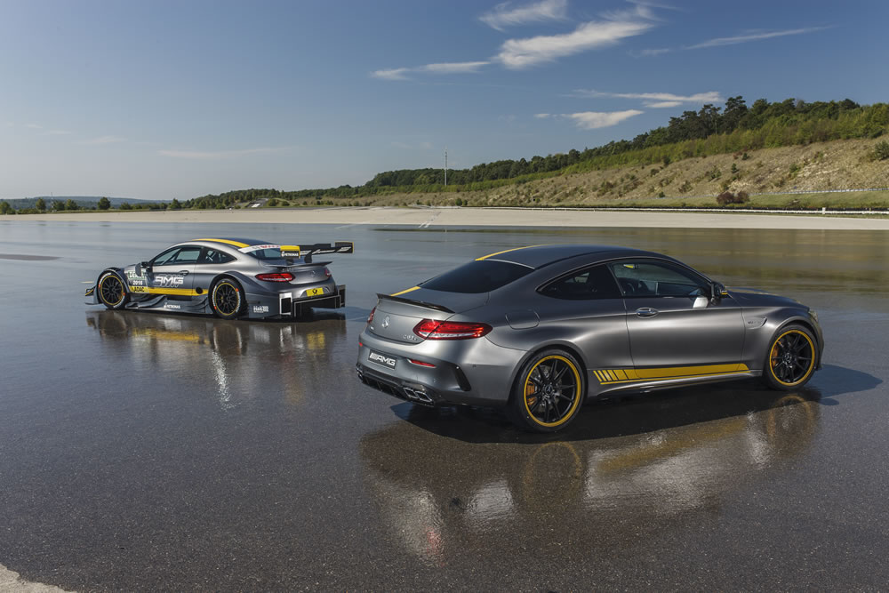 Mercedes-AMG are launching the special Edition 1 C 63 Coupé. The exclusive colour combination in designo selenite grey magno with yellow foil treatment and black wheels with rim flanges picked out in yellow reflects the graphic design of the IAA-launch version of the Mercedes-AMG C 63 DTM racing coupé which will contest the German Touring Car Masters (DTM) next year. The special model’s equipment with performance seats and aerodynamic package emphasises its motor racing pedigree.