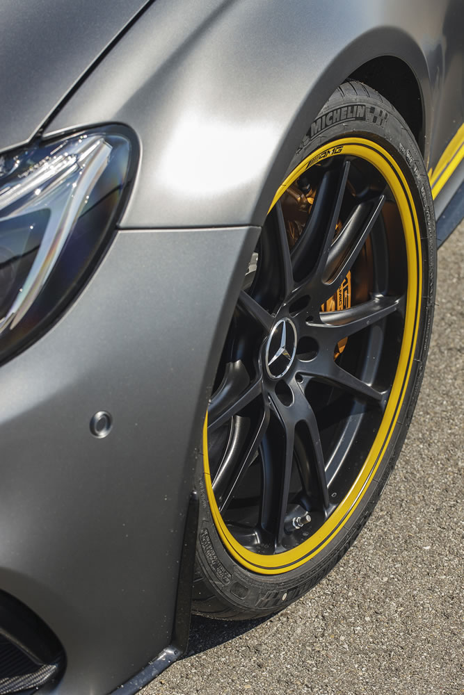 The ultra-light, matt-black AMG Performance forged wheels of 5-twin-spoke design with yellow painted rim flanges are also highly distinctive. At the front, 9.0 J x 19 rims with 255/35 R 19 tyres are used, while the car is equipped with 10.5 J x 20 rims and 285/30 R 20 tyres to the rear. The special sports tyres offer a noticeably increased level of grip on dry roads. The Edition 1 C 63 S Coupé is fitted as standard with the AMG ceramic composite high-performance braking system which provides the highest possible deceleration values and a lower unsprung mass, while also increasing racetrack performance.