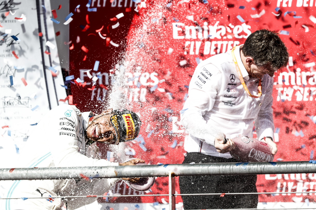 It’s hard to explain what I’m feeling right now, to be honest. Cloud nine doesn’t even get close, it’s somewhere far above that. It’s been the hardest year I can remember; it’s been so challenging, going through the ups and downs, so right now I’m just so full of emotion, it’s overwhelming. I feel truly humbled, and really, really grateful to everyone back at the factories, the entire Daimler family and everyone at PETRONAS – everyone who has worked so hard to enable us to do what we do and achieve this. It’s such a privilege and honour to work for this team, to be able to go out there and have the platform to put in performances like today. And Niki, I miss him so much. Today, he’d have taken his cap off. I wouldn’t have been able to do this without Niki, he’s here with us in spirit. I saw my parents right after the race and seeing my dad’s smile, it says it all. My family have supported me since day one, they worked so hard for me to be here today. I’m so glad they could all come out here, together. Yesterday was a difficult day and today I just wanted to recover and deliver a one-two for the team. Valtteri did a fantastic job, so huge congratulations to him.