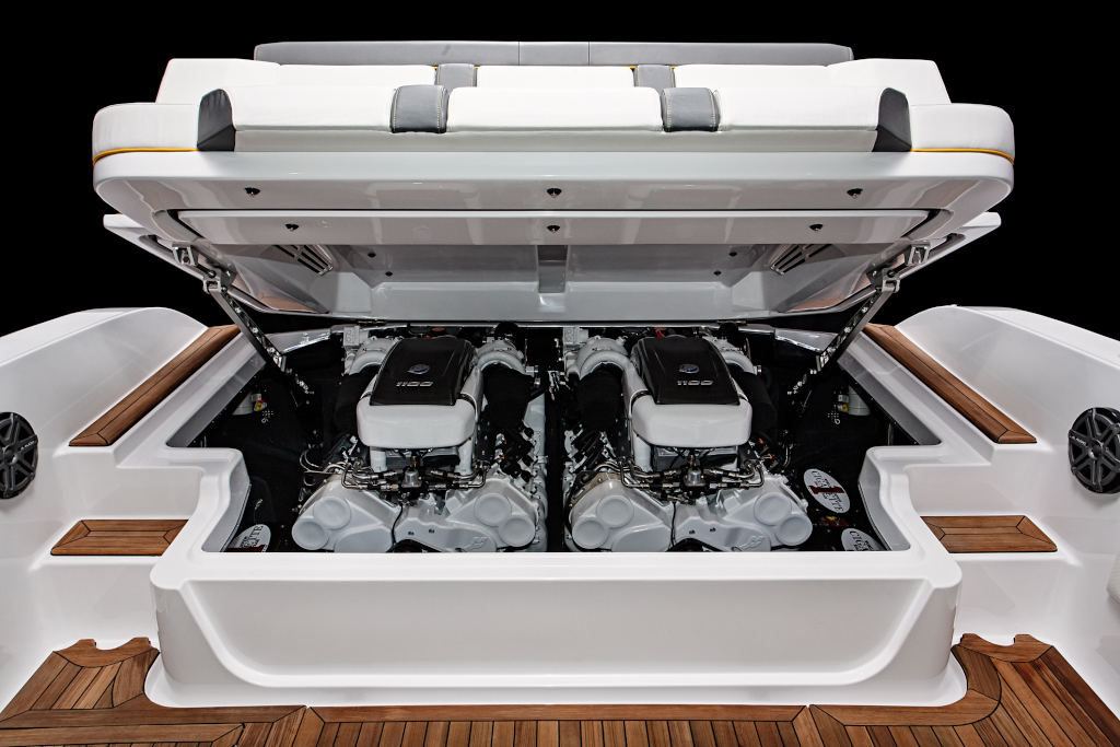 The Cigarette Racing Team 41’ SD GT3 is powered by a pair of Mercury Racing 1100 HP engines with NXT6 Drives. The 41’ long and 11’ beam boat is able to achieve an estimated prop limited top speed of more than 100 mph with a focus on big water performance and weight of just over 20,000 lbs.