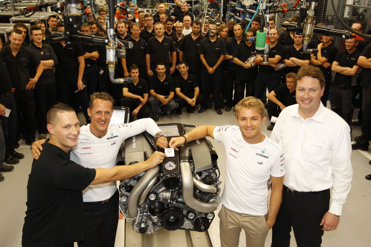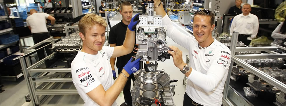 Michael and Nico recently completed a whirlwind tour of the Mercedes-Benz facilities near the company headquarters in Stuttgart, Germany. After visiting the production facilities for the new A-Class and B-Class compact models in Rastatt, the drivers tried their hand at assembling the pistons and cylinder heads of a high-performance AMG engine at Mercedes-AMG in Affalterbach.