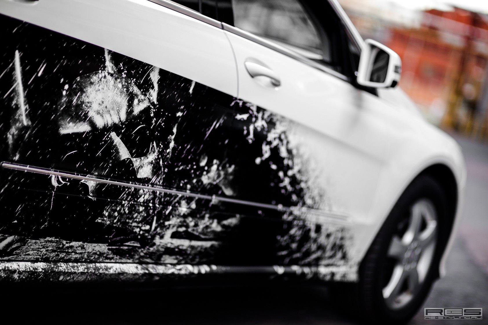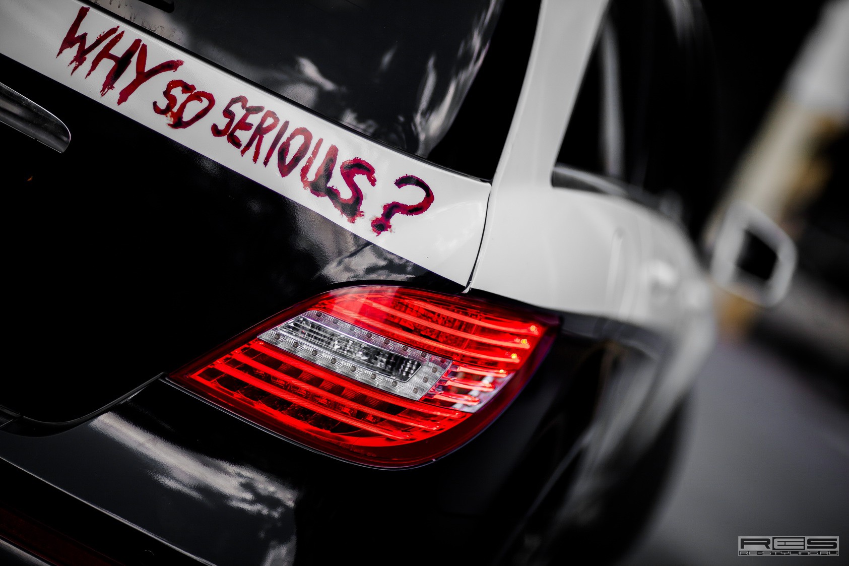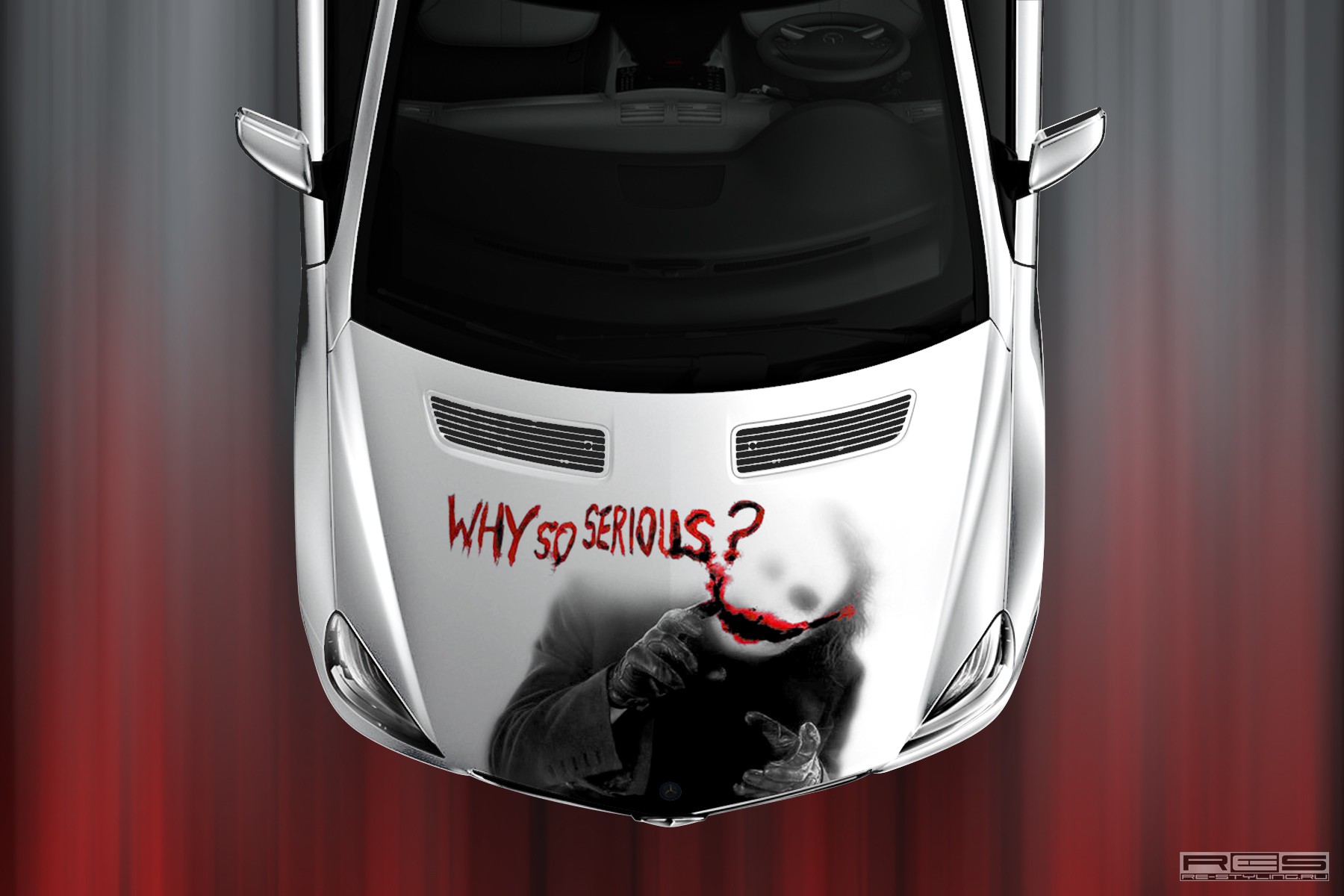On the driver’s side, an image looking upwards at Gotham’s skyscrapers join to form a subliminal Dark Knight symbol, while the passenger side notes a gritty view of an empty Dark Knight mask. The most notable artwork, however, is up front on the hood, where a ghostly image of Heath Ledger’s Joker spells out the question “Why so serious?” in blood red.