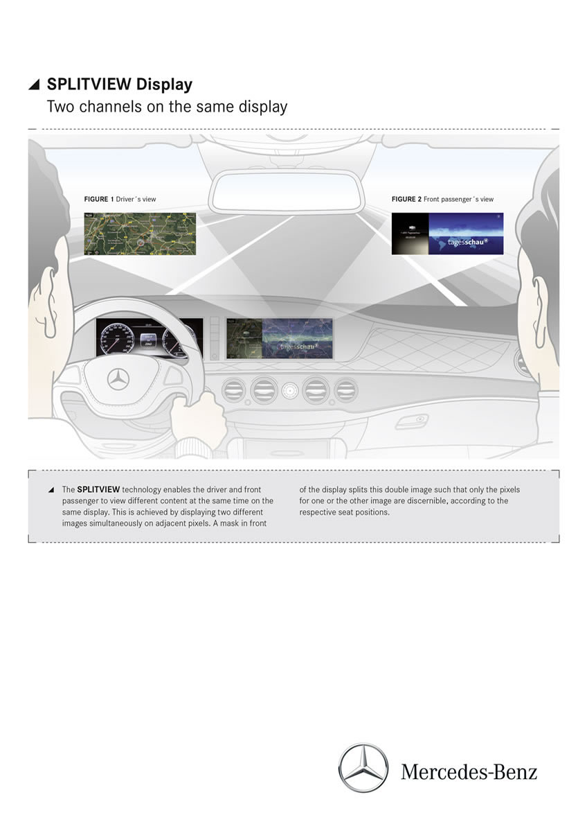 The new S-Class is the first vehicle worldwide to offer a genuine multi-user system for entertainment functions. This means that there is independent access to the media sources of the entertainment system from any of the four seats – i.e. radio, TV, internet, navigation, DVD player and USB-connected devices.