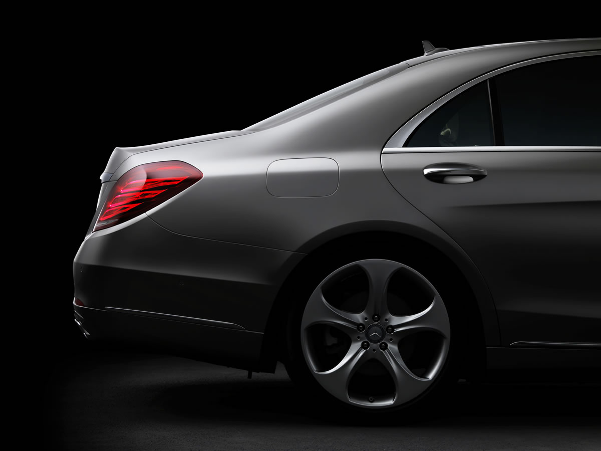 The extravagantly sculpted surfaces and lines of the side wall on the new S-Class generate excitement as they flow into the rear end. As well as being elegant, the slightly slanting form has aerodynamic advantages.