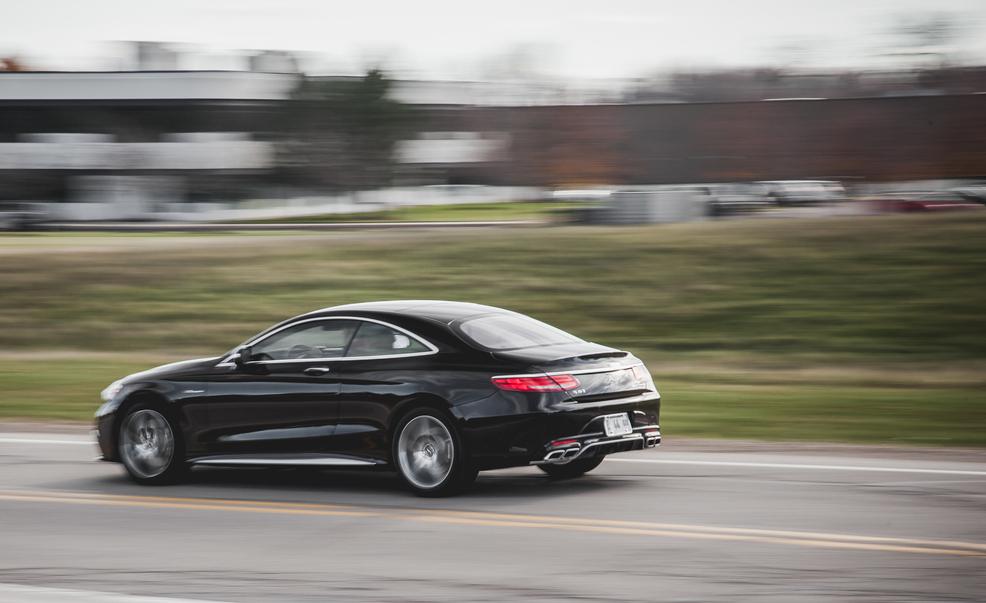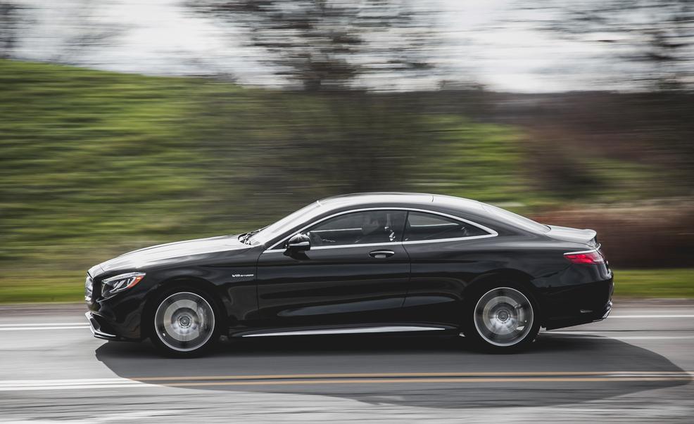 So rich is the luxury in the S63 AMG coupe that the performance seems like an afterthought. At 577 horsepower and 664 lb-ft of torque, the 5.5-liter twin-turbo V-8 has just 14 horsepower on the old Performance pack–equipped CL63 AMG. More effective is the new, standard 4MATIC four-wheel-drive system, which trims time off of the low end of acceleration sprints. The S63 coupe launches with the smooth, unrelenting pull of a riptide as the four-wheel traction and 4744-pound weight mask just how quick it is. Triple-digit speeds arrive in just 8.5 seconds. The quarter-mile flashes by at 120 mph in 12 seconds flat. Both the 60-mph and quarter-mile times top those of the defunct CL63 AMG by 0.3 second and the Bentley Continental GT V-8 S by two-tenths. Continental ContiSportContact 5P tires deliver an impressive 0.96 g of roadholding and a 70-mph stopping distance of 157 feet. And when you come to your senses and remember that there’s a Ferrari at home for driving like a lunatic, you can switch on the adaptive cruise control and the steering assist that guides the car in the center of its lane.
