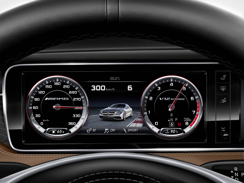 Another typical AMG speciality is the AMG instrument cluster: information on the engine speed, vehicle speed and much more appears on two animated round dials on the 31.2 centimetre, high-resolution colour TFT display. The typography, the needles in red/silver, the speedometer with its 360 km/h scale and the “V12 BITURBO” lettering in the rev counter all have a specifically AMG look. When the driver’s door is opened, an AMG start-up screen appears on the right-hand display, while an animated S 65 AMG Coupé appears in the instrument cluster.