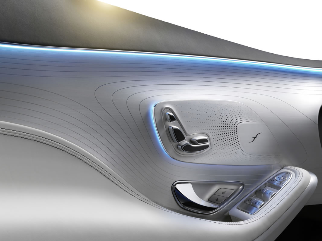 The door panels of the Concept S-Class Coupe are made from aluminum. Using computer algorithms delicate topographic lines were milled into the metal and mimic the contours of the door-mounted control elements. This creates an interesting light pattern with tiny sparkling highlights. For this creation the designers drew their inspiration from rock formations in Utah. The progressive perforations of the loudspeakers were also generated using algorithms and display some intelligent aesthetics of mathematics.
