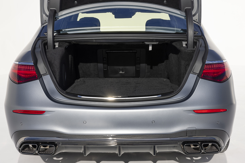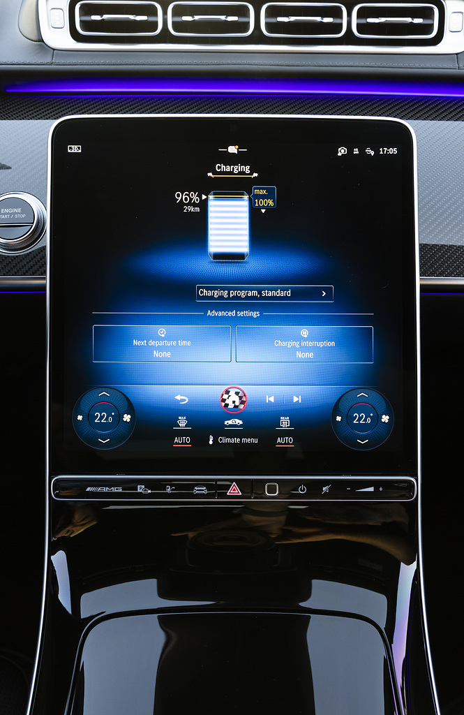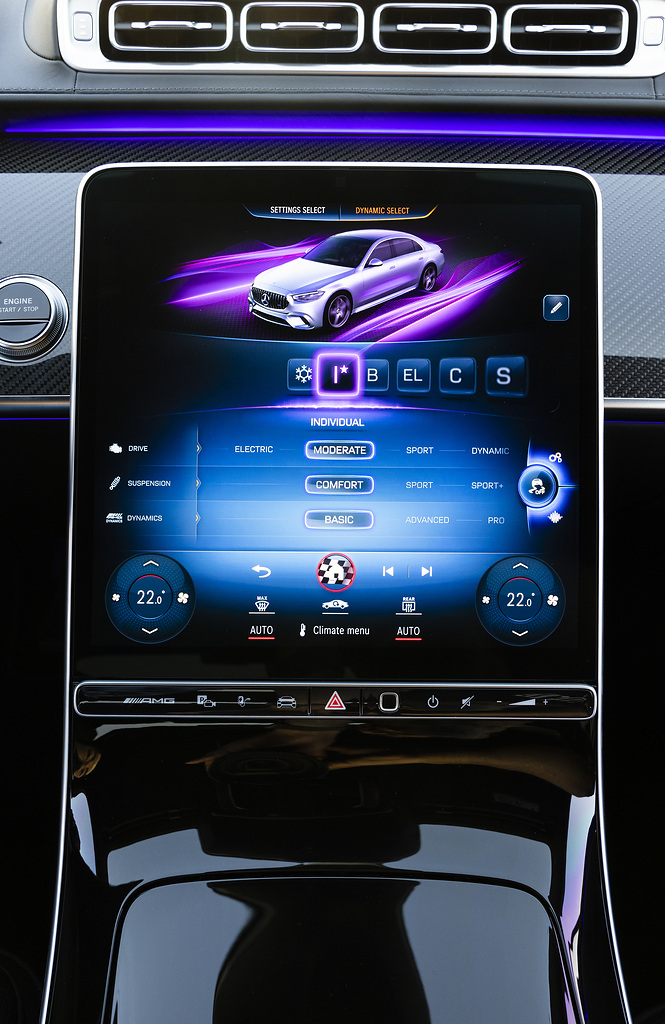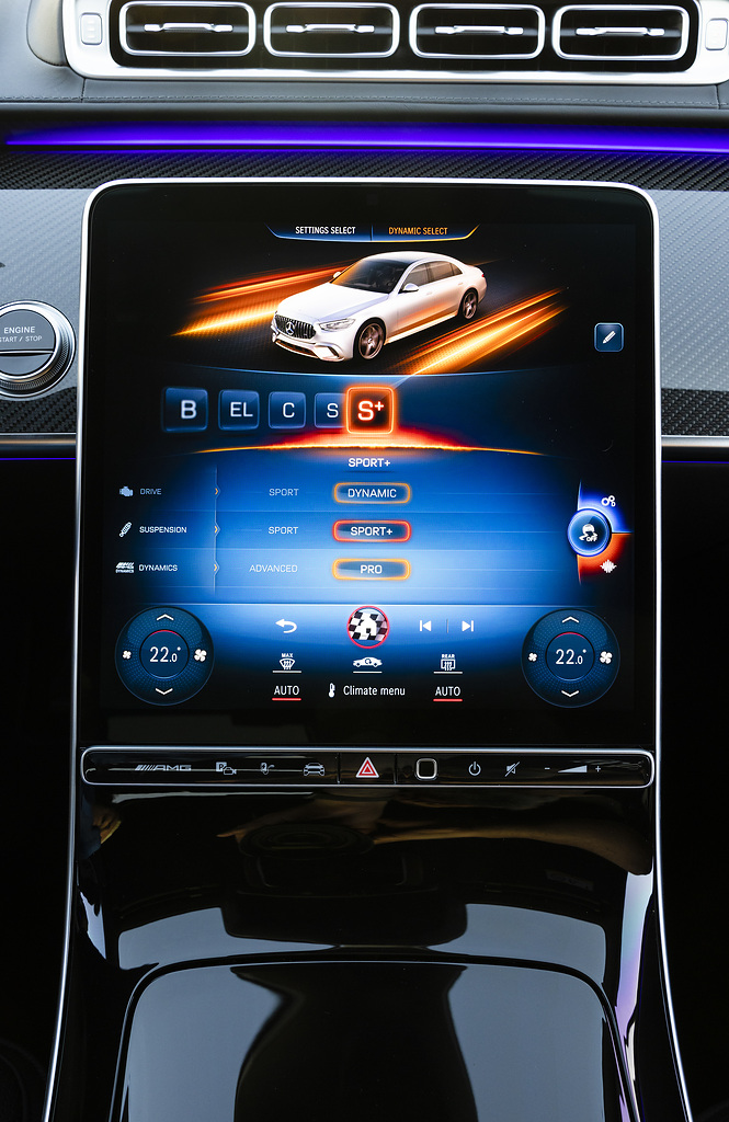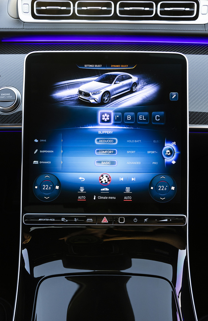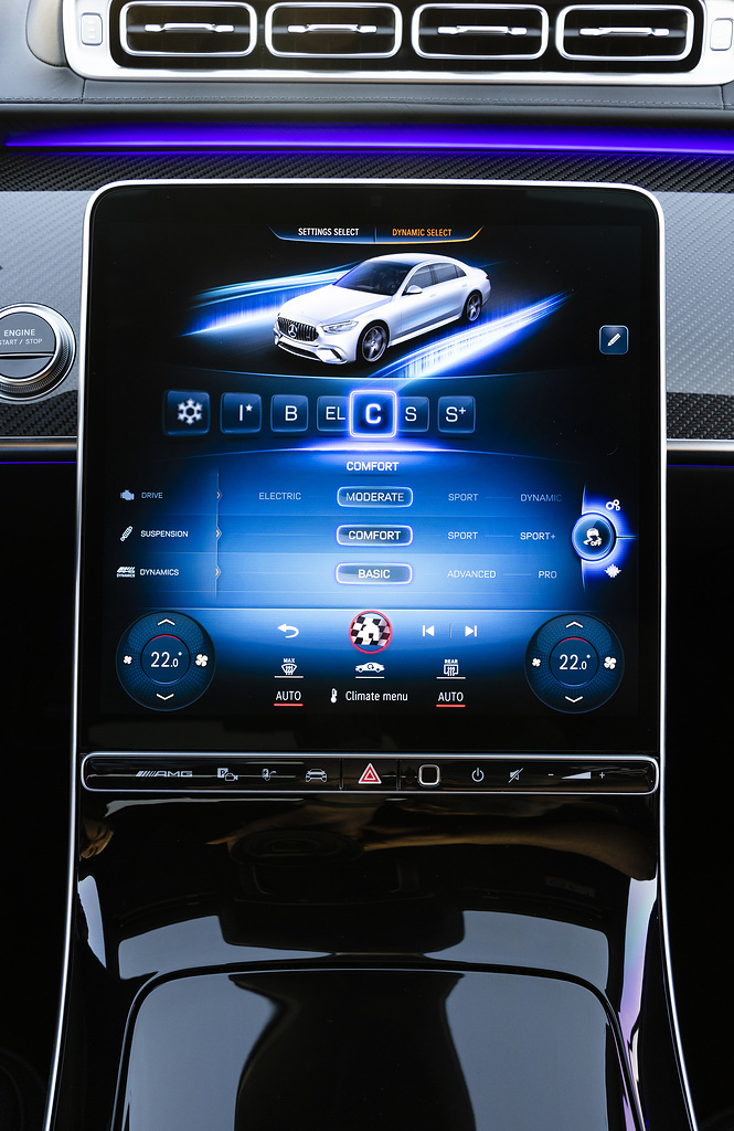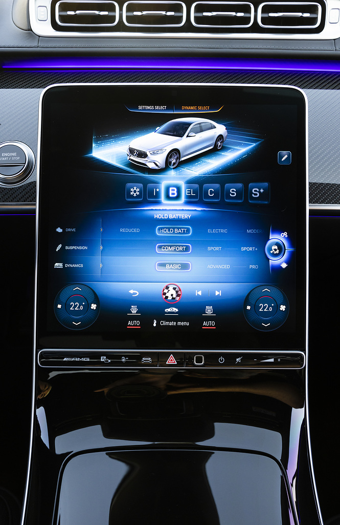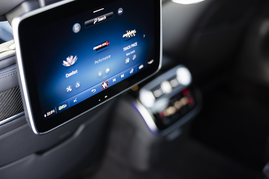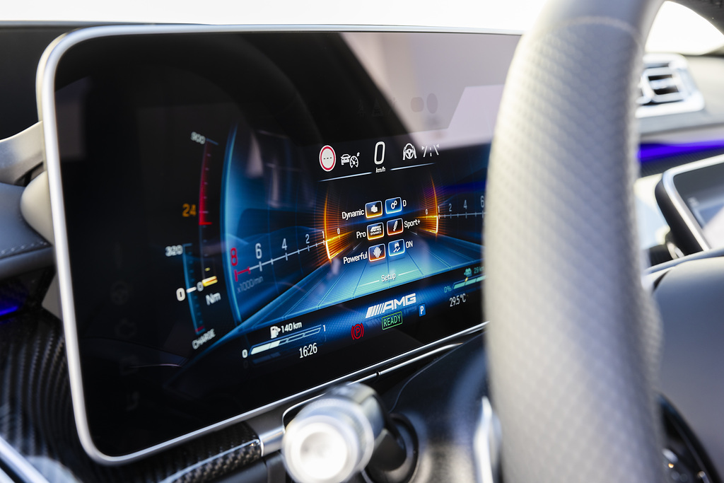 The focus of the powertrain, however, is less on electric range and more on best-in-class performance. With 590 kW (802 hp) of system output and 1430 Nm of system torque, the saloon sets new standards in the segment. The acceleration of 3.3 seconds to 100 km/h and the optional top speed of 290 km/h underline the superior, dynamic driving performance. Systems such as the AMG RIDE CONTROL+ suspension, AMG ACTIVE RIDE CONTROL roll stabilisation and rear-axle steering as standard ensure a wide spread between driving dynamics and comfort.
