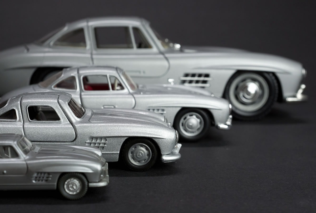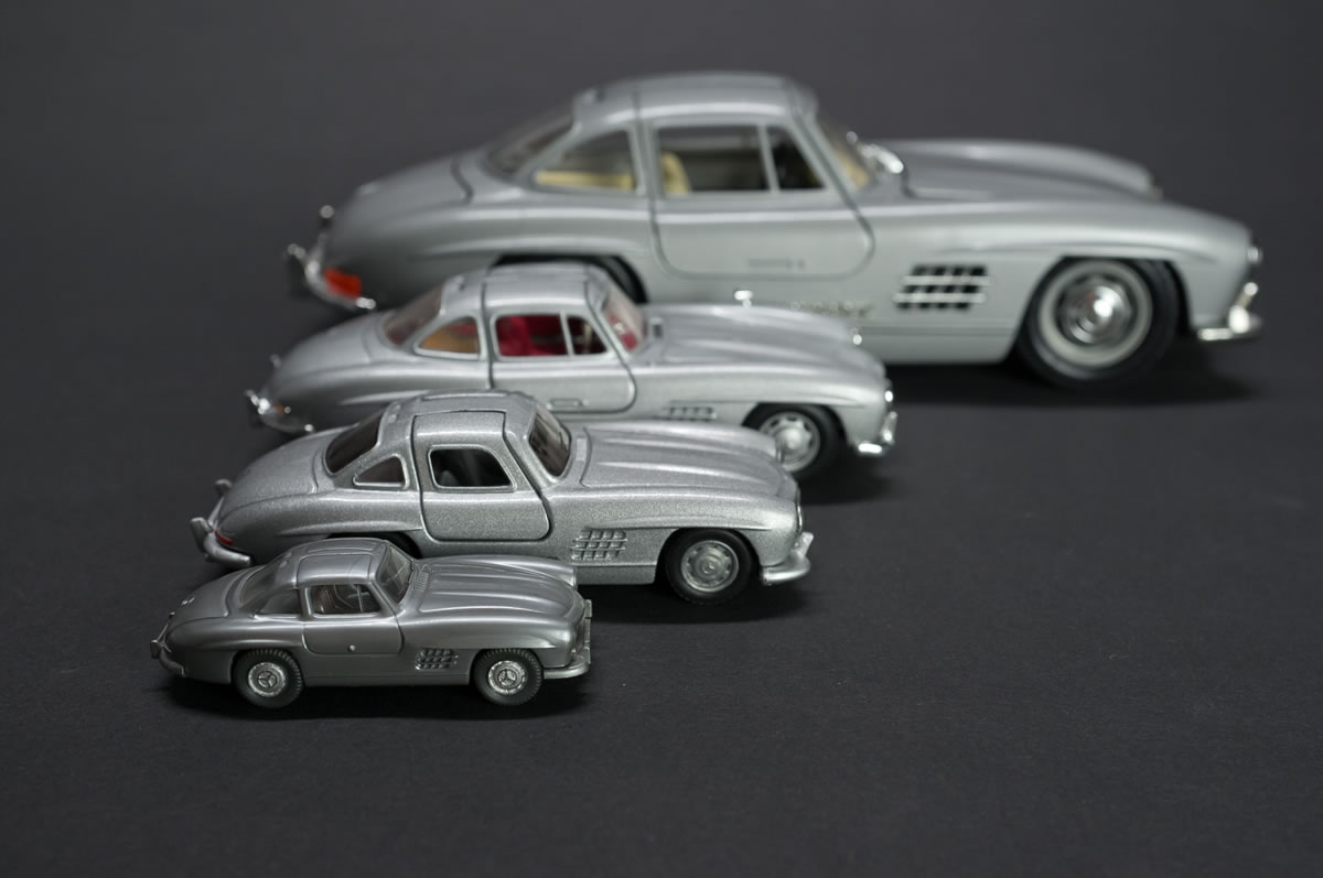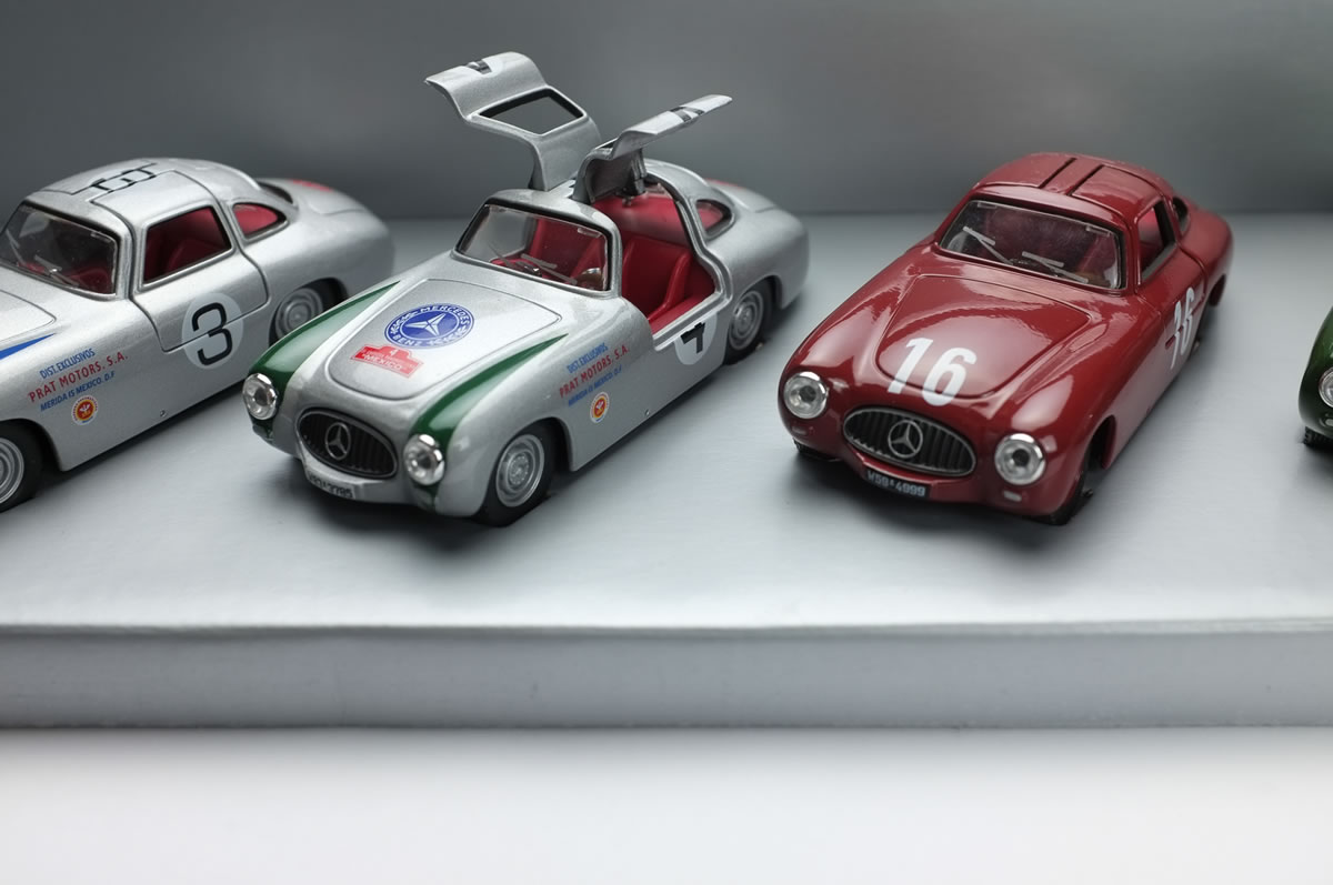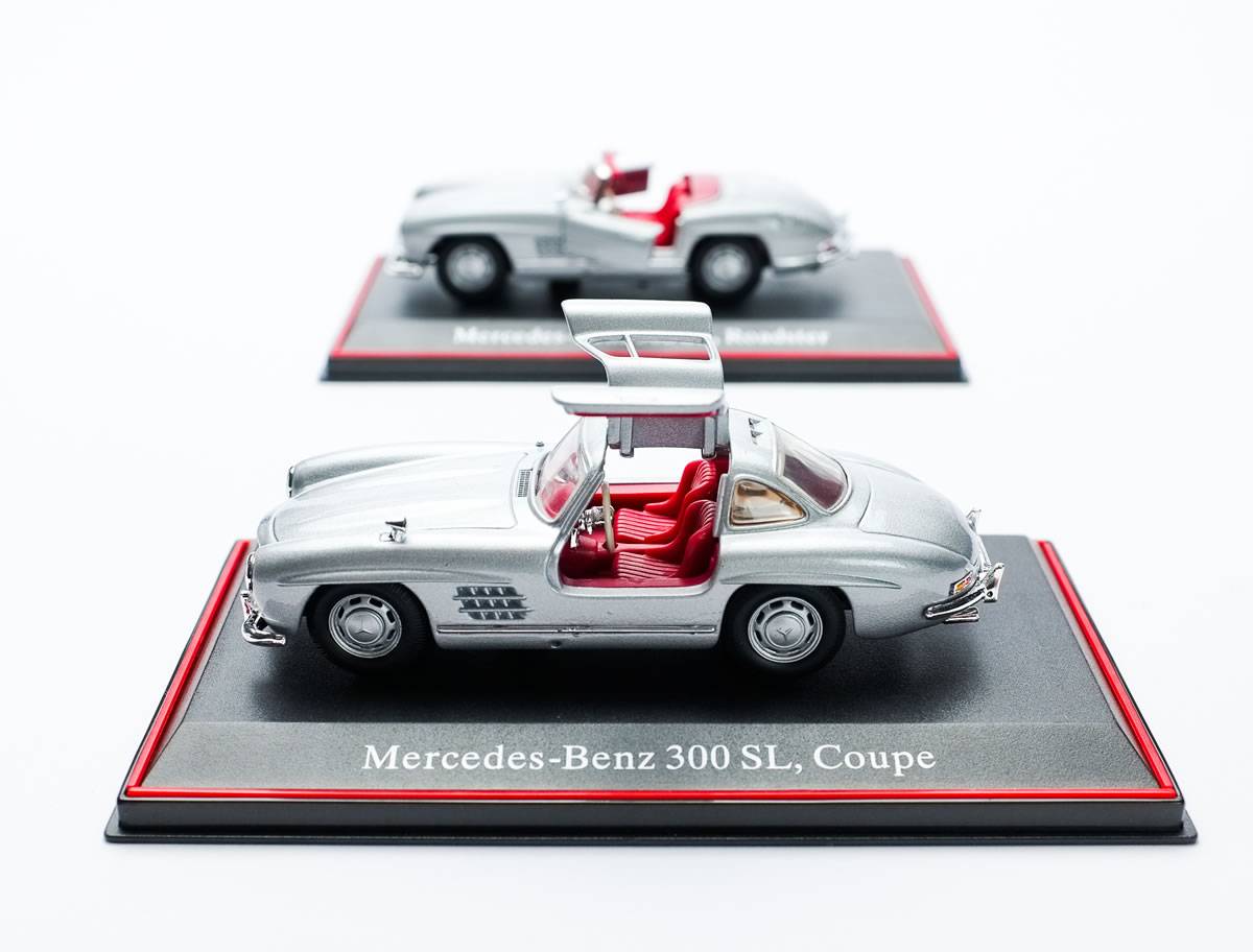 Sports cars evoke particularly strong emotions in their original versions, so it’s no surprise that their scaled-down counterparts also present an exciting chapter in the story of model cars. Among the types most often represented in miniature format is the Mercedes-Benz 300 SL Coupé (W 198 I, 1954 to 1957) and the 190 SL (W 121, 1955 to 1963). Both remain popular models for new miniatures. These classic sports cars showcase the wide range of sizes, materials, and attention to detail that characterises the culture of model cars.