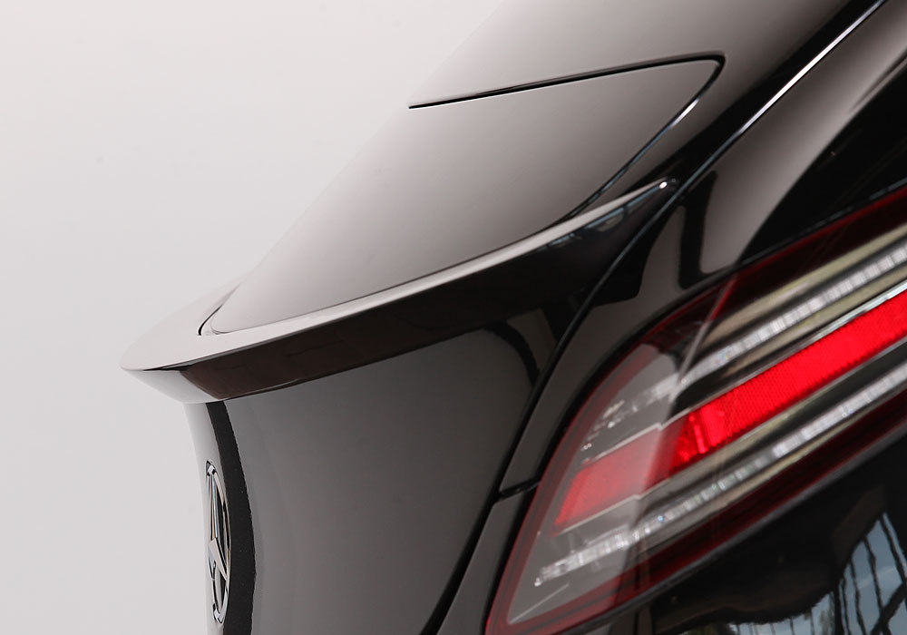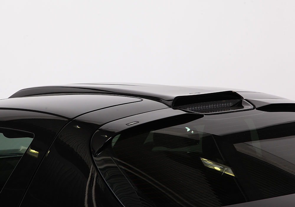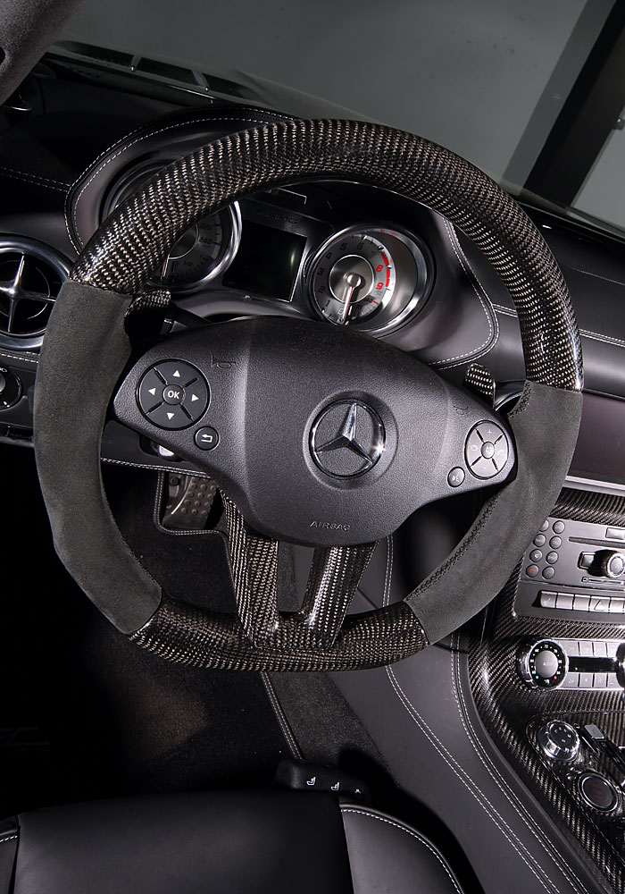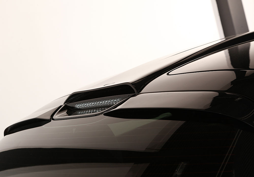 Side skirts with optional four LEDs per side are installed with the SLS Roadsters rear spoiler finished in carbon. A two-piece rear window spoiler is finished in the vehicle color and the roof air scoop also is colored to match the vehicle as well. Of course, being MED Design, all body kit parts are optionally available in a carbon fiber finish.