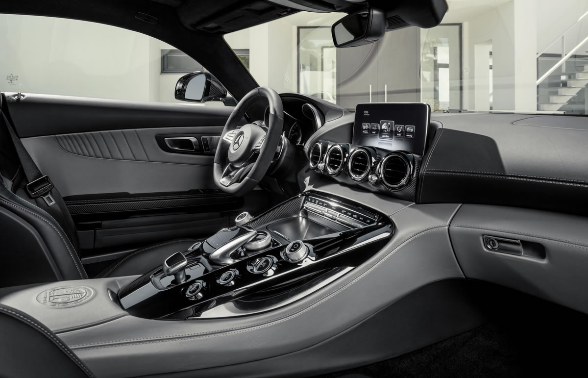The central “aviation design” theme, which is the hallmark of Mercedes-Benz sports cars, has been restyled. The extreme emphasis on the width of the dashboard, which creates an impression of a powerful wing dominates the cockpit of the GT. Four central spotlight-style vents and the individual vents at each end of the dashboard reinforce this impression. The combination of high beltlines, concave-shaped door paneling, low seating position and a dramatic center console design, makes the GT feel like you are slipping into the cockpit of fighter jet.