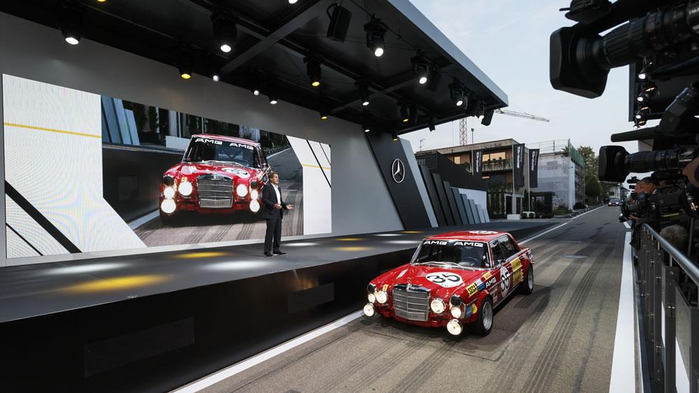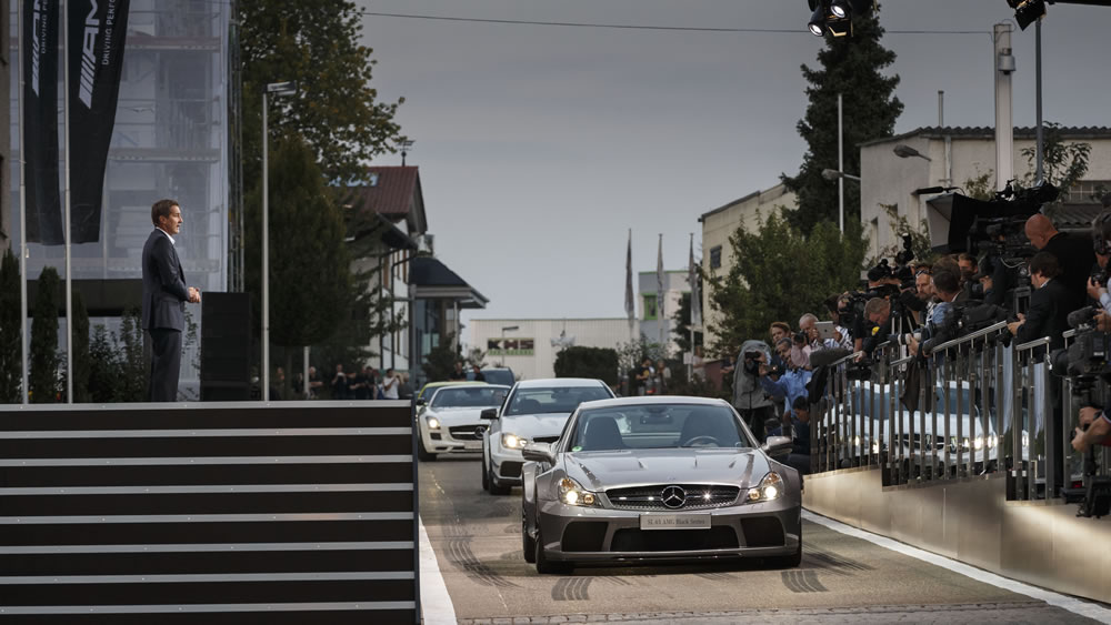 As exciting as crossing the finish line in a car race – that was how Mercedes-AMG presented its new GT V8 sports car this evening, the second vehicle to be entirely developed under its own direction. None other than current Formula 1 points leader Nico Rosberg piloted the breath-taking newcomer from the sports car brand of Mercedes-Benz onto the stage. The emotions ran high for around 400 international guests from the worlds of politics, business and the media, including AMG’s founders Hans Werner Aufrecht and Erhard Melcher, as the Mercedes-AMG GT made its début in its birthplace. Previously, Bernd Schneider, five-time DTM champion and with 43 victories the most successful DTM driver of all time, presented a parade of the most famous vehicles from AMG’s history.