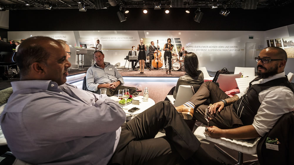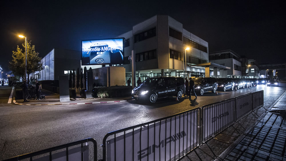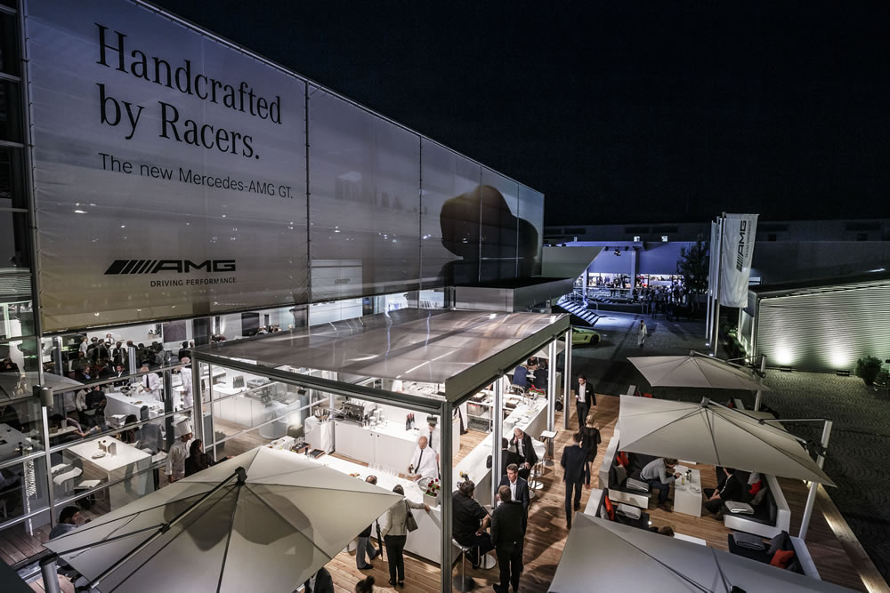 Mercedes-AMG created an authentic motor sports atmosphere at its head office in Affalterbach for the first appearance of the new GT under the eyes of the world. A temporary pit lane with stands for spectators and a victory fireworks show set the perfect scene for the début of an ambitious new challenger.