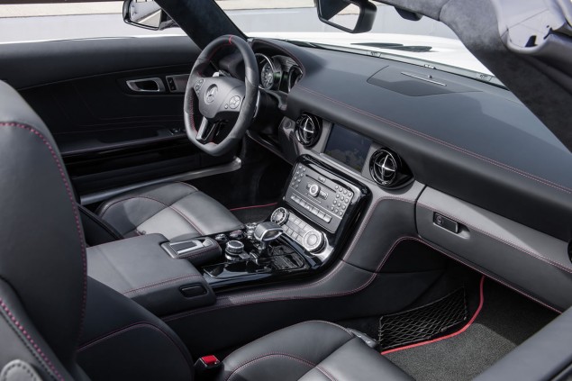 The interior too features a consistently sporty design: the SLS AMG GT combines the high-quality, exclusive ambience of a true AMG model with the functional atmosphere of a racing car. The sports seats not only have an embossed badge on the head restraints, but the centre sections are also finished in Alcantara®. Continuing the theme, Alcantara® is also found on the door centre panels. The black interior appointments are combined with red seat belts, plus all of the contrasting stitching on the AMG sports seats, the centre console and the door panel lining is finished in red too. The floor mats also feature red edging.