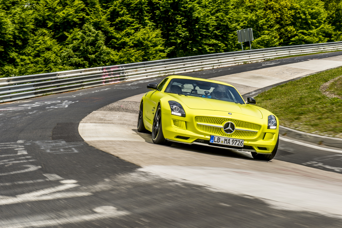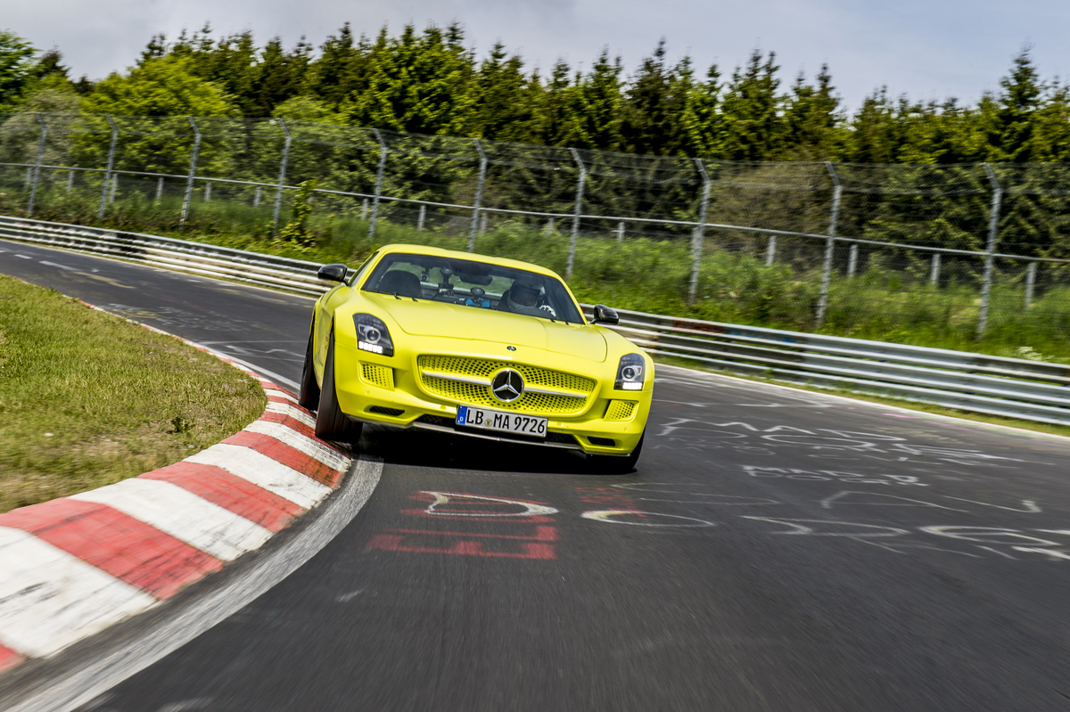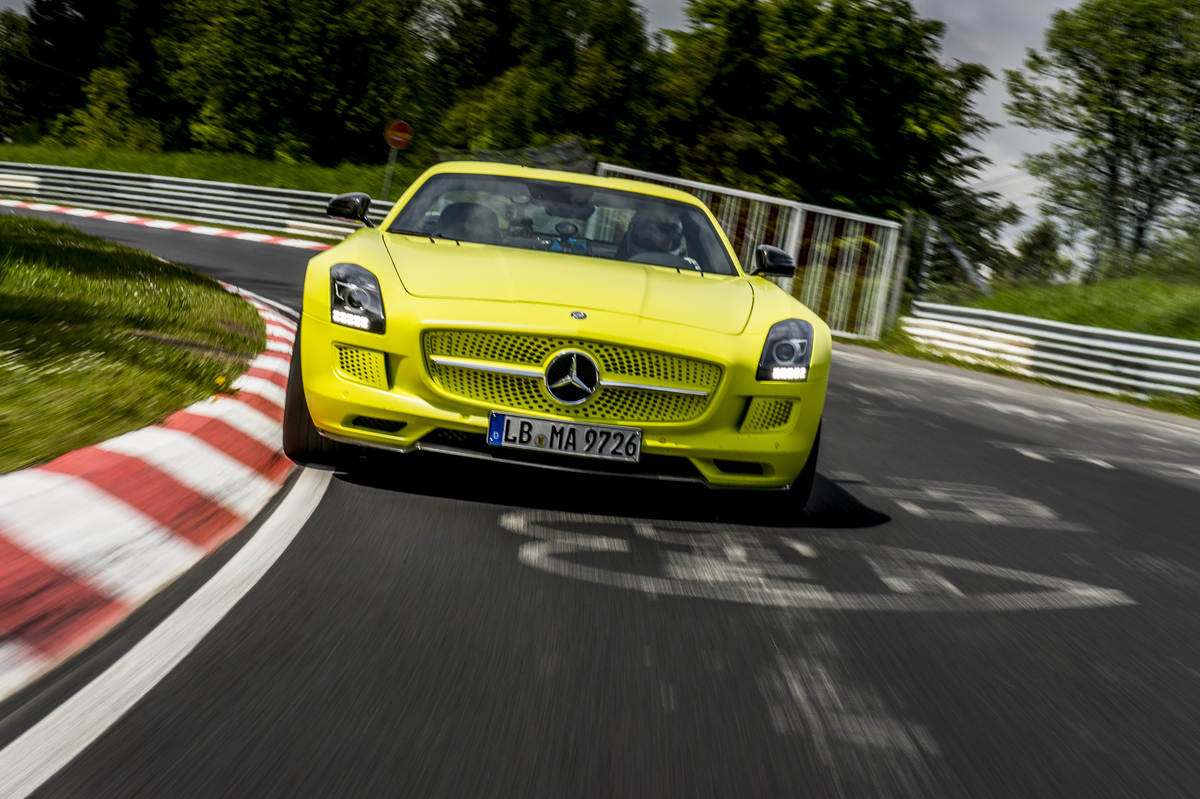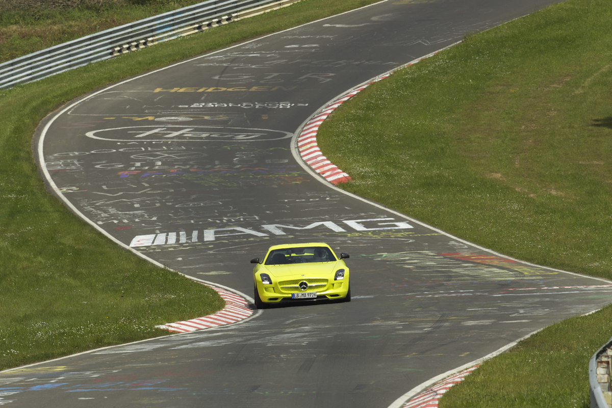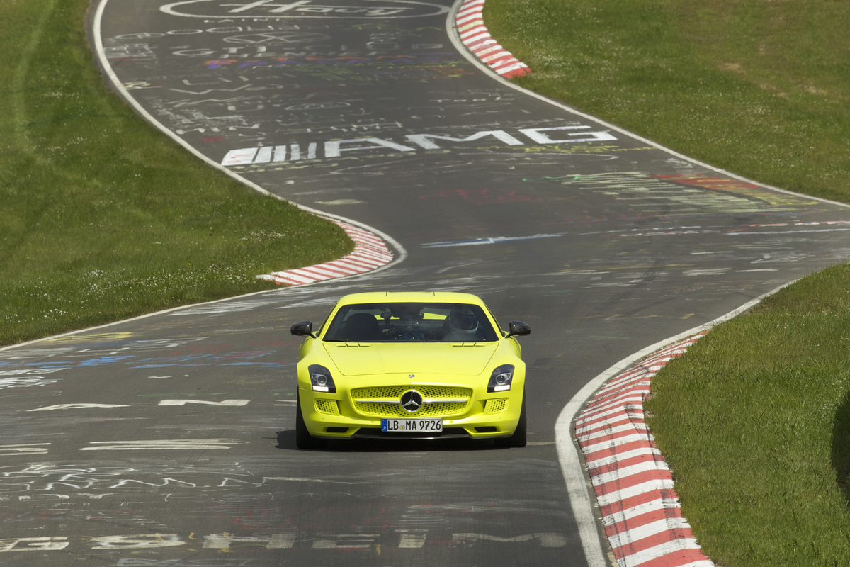 The Mercedes-Benz SLS AMG Coupé Electric Drive circled the Nürburgring Nordschleife (“north loop”) in a record time of 7:56.234 minutes. Therefore, the electric AMG super sports car is at the same time the first electrically-powered series production vehicle, which masters the legendary race track in under eight minutes. The record time of the SLS AMG Coupé Electric Drive was notarially certified. Two weeks after the first overall win for the Mercedes-Benz SLS AMG GT3 in the 24 Hours Nürburgring, a further member of the SLS AMG family impressively demonstrates its potential on the most difficult race track worldwide.