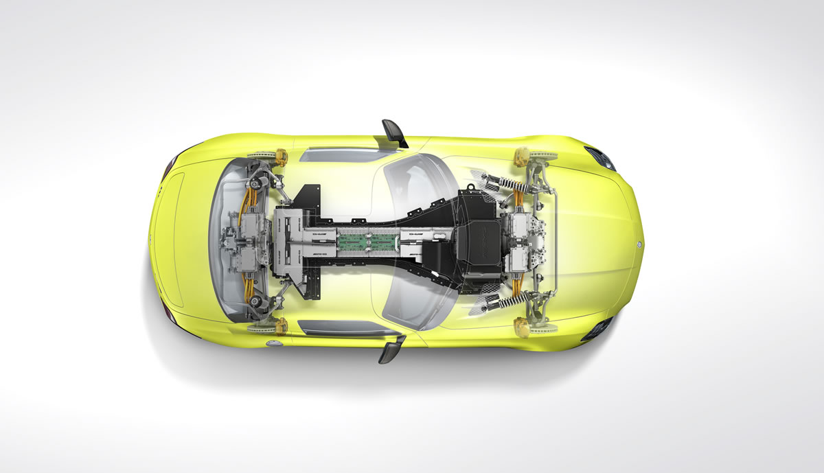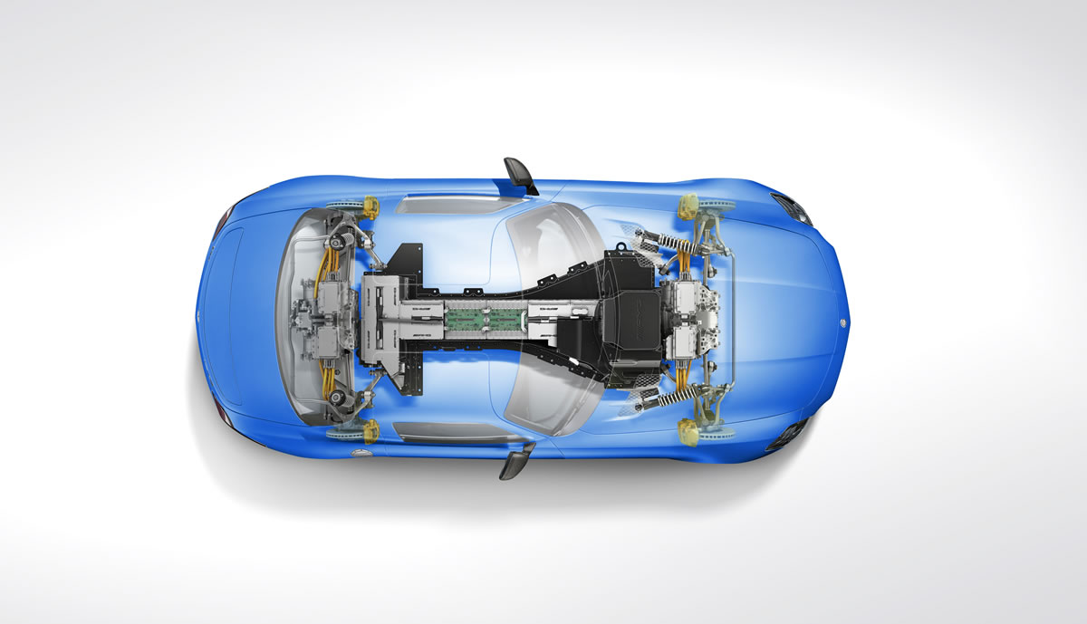 The additional front-wheel drive called for a newly designed front axle: unlike the series production vehicle with AMG V8 engine, which has a double wishbone axle, the SLS AMG Coupé Electric Drive features an independent multi-link suspension with pushrod damper struts. This is because the vertically-arranged damper struts had to make way for the additional drive shafts. As is usual in a wide variety of racing vehicles, horizontal damper struts are now used, which are operated via separate push rods and transfer levers. Thanks to this sophisticated front-axle design, which has already been tried and tested in the world of motorsport, the agility and driving dynamics of the SLS AMG Coupé Electric Drive attain the same high levels as the V8 variant. Another distinguishing feature is the speed-sensitive power steering with rack-and-pinion steering gear: the power assistance is implemented electrohydraulically rather than just hydraulically.