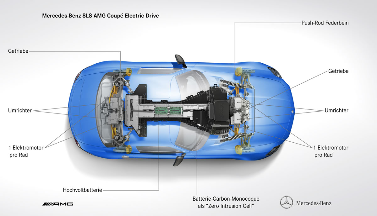 By using this design, Mercedes-AMG ensures maximum safety during production of the vehicle and also during maintenance and repair work. Of course the SLS AMG Coupé Electric Drive also meets all of the statutory and internal Mercedes crash test requirements.