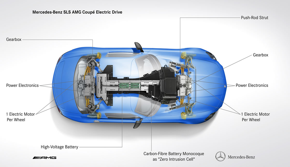 When designing the Mercedes SLS AMG Coupé Electric Drive, Mercedes AMG took a few styling tips from the F1 racing world. In addition to the body and drivetrain that uses F1 technology, AMG designers also adopted the racing rule of beginning with the the drive engineering and working their way out. In this case, the electric drivetrain is the focus of the SLS AMG.Acting as the car’s spine, the battery is located within a carbon-fiber monocoque, around that is the aluminum spaceframe body.. Keeping the center of gravity low, the battery compartment is near to the ground and spread along the length of the car to keep the weight evenly distributed.