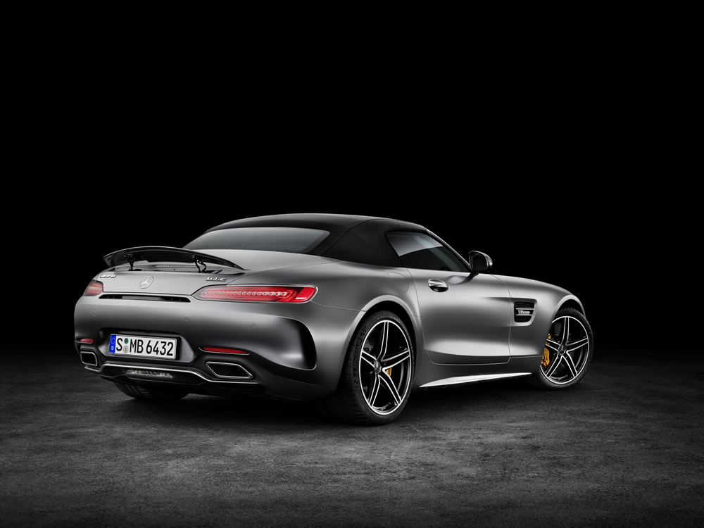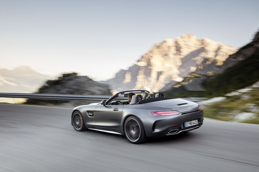 The AMG GT C Roadster not only delivers more output and torque, it also impresses with numerous technical highlights from the Mercedes‑AMG GT R for even more dynamic performance. Like the AMG GT R, the AMG GT C Roadster is recognisable by its wide, muscular rear end and large wheels. Other technical measures include the wider rear track and active rear axle steering.