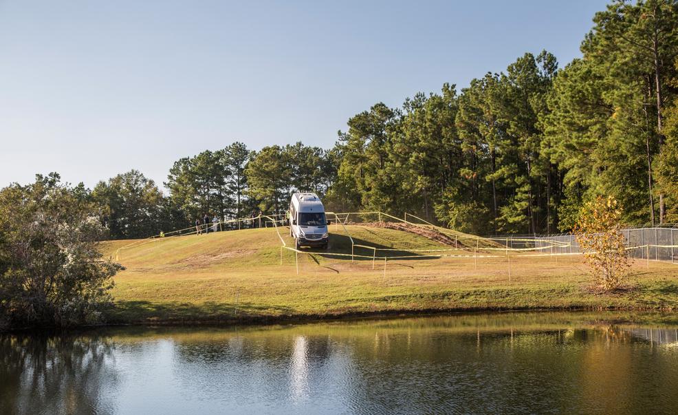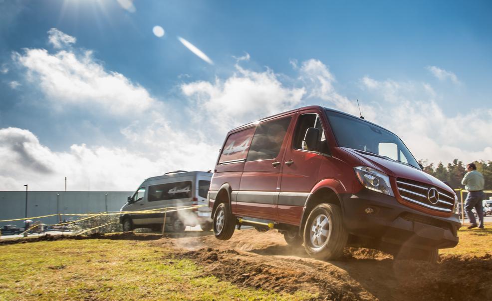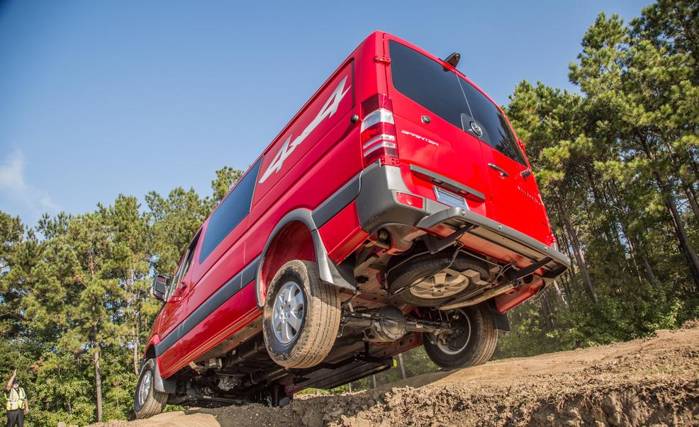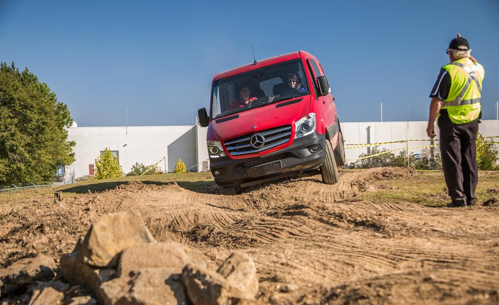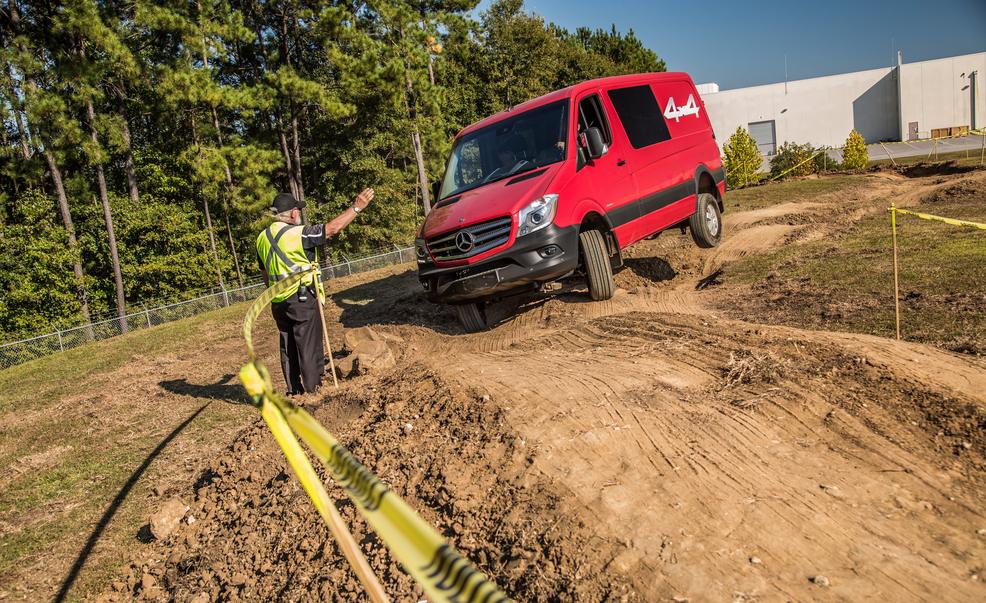 Never before have we pondered a subconscious connection with the contents of an uncracked egg, but there’s a first time for everything. In this case, the Mercedes-Benz Sprinter 4×4 is the shell and we’re its quivery innards, practically foaming as the big van teeter-totters up and down a craggy off-road course outside of the Ladson, South Carolina, facility where U.S.-market Sprinters are assembled. Our squishy sensitivities aside, this is the ideal first encounter with the Sprinter’s newly available four-wheel-drive system, which has been offered on global models for some time but is only just reaching our shores for the 2015 model year.
