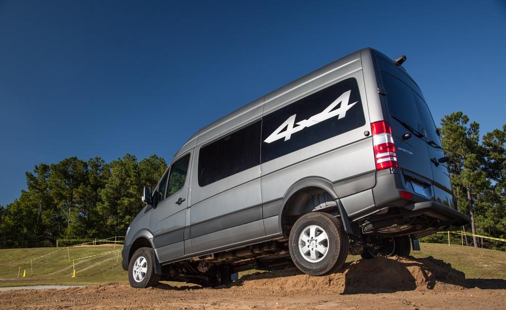r, crew, cargo) in either wheelbase length (144.3 or 170.3 inches) can be equipped with four-wheel drive and a nifty “4×4” badge. (Add another $300 for a low-range transfer case with a 42-percent-lower crawl ratio.) To get four-wheel drive, buyers must also order the 188-hp V-6 turbo-diesel and five-speed automatic. The four-cylinder turbo-diesel/seven-speed automatic that joined the refreshed-for-2014 Sprinter lineup remains rear-drive-only.
