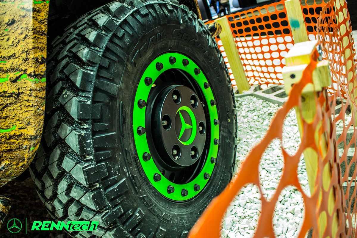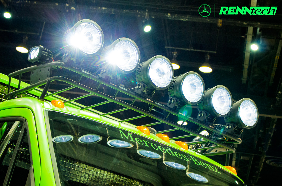 Long-time Mercedes-Benz customizer RENNtech added numerous touches to the Sprinter Cab Chassis in order to bring it from mild to wild. Starting at the front, a custom roof rack was built to support six forward-facing lights while additional spotlights are positioned on the sides of the roof rack. A custom brush guard complete with additional fog lights and a powerful winch are located beneath the Sprinter 3500’s front bumper.