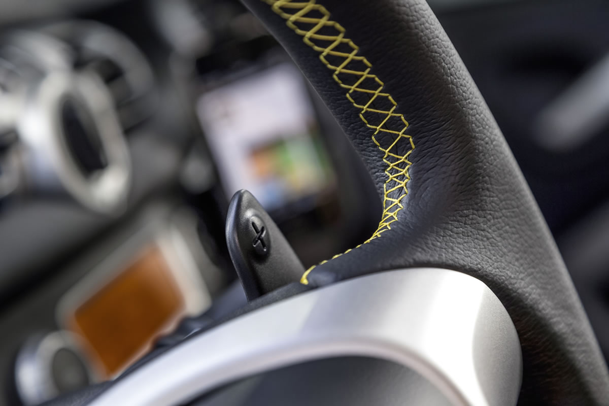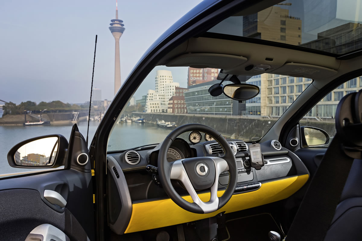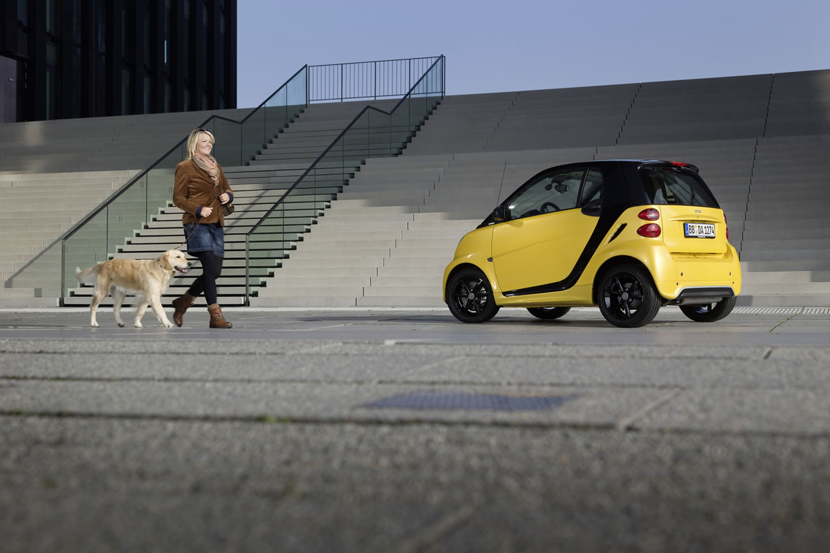 The latest smart fortwo special model has been christened “edition cityflame”. With this model smart is honing in on the latest color trends whilst also meeting the wishes of many customers for even greater individualisation. The most striking exterior features are the bodypanels in an eye-catching pearlescent flame yellow finish (alternatively also available in black). The yellow paintwork has a particularly sporty and expressive effect in combination with the black tridion safety cell, the exclusive black-painted 3-double-spoke alloy wheels with wide tyres (175/55 R 15 at the front and 195/50 R 15 at the rear) and the black door mirror caps.