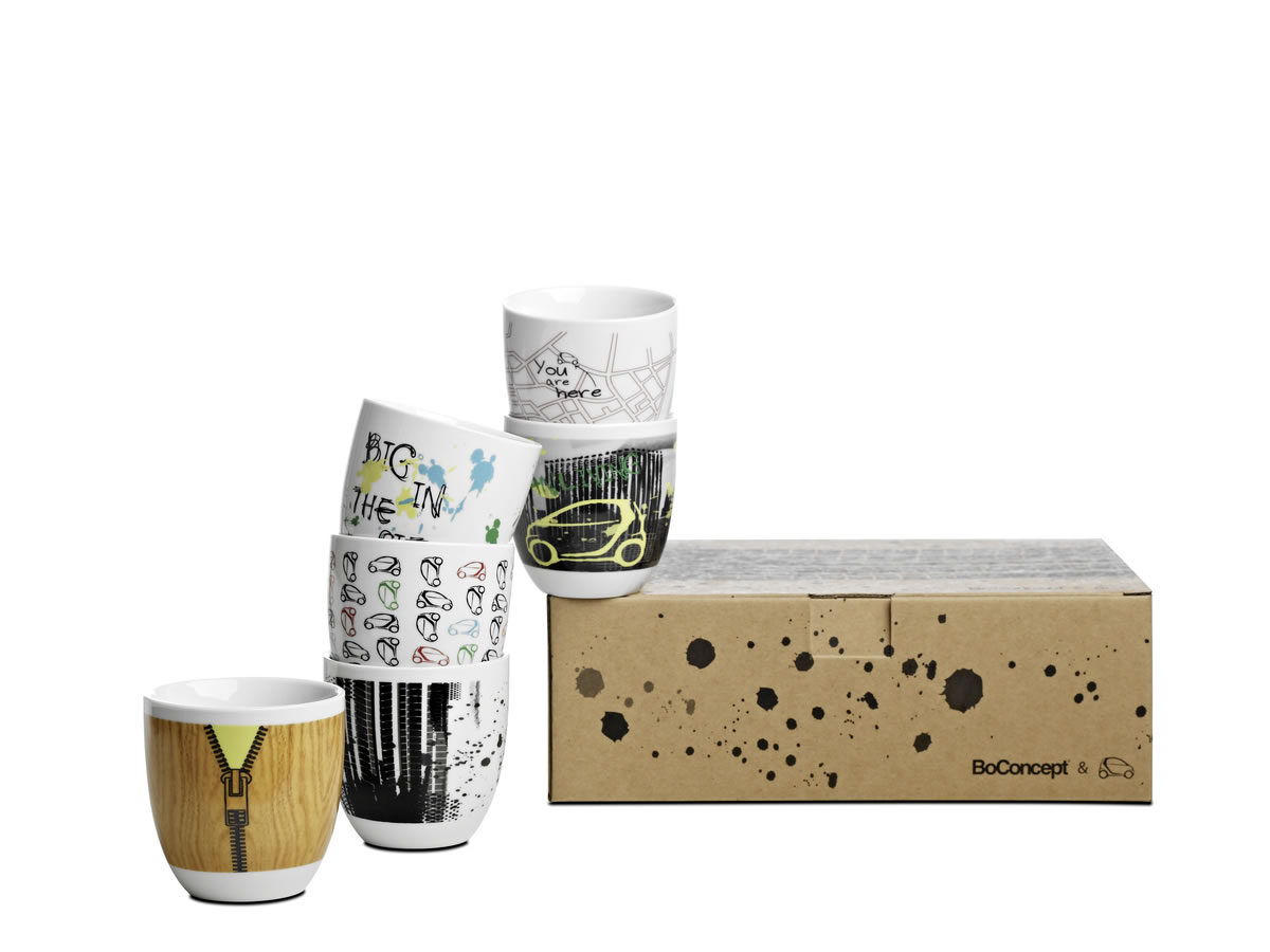 The mug design is borrowed from the popular BoConcept Collector’s Item line, which launches new designs once a year. The accessories collection also features a wooden replica of the clock found in the smart fortwo BoConcept signature style car.