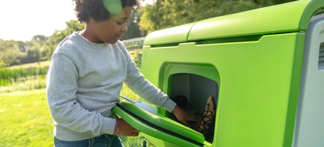 Another available option for the Eglu Cube is the Autodoor, which automatically opens and closes the door to the coop at times you specify, or at sunrise and sundown. It’s installed in place of the standard Eglu door, and it helps automate the process of caring for your chickens even more.