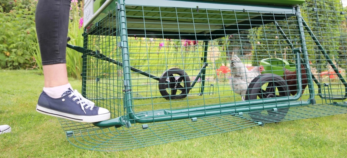 In terms of caring for your chickens, the the Eglu is beautifully designed and makes caring for you chickens as simple as possible. You have the option of a 6′, 9′ or 12′ run, and once attached, the run provides a seamless space for your chickens to explore. Because the Eglu Cube is elevated, the chickens always have a covered space to protect them from the sun or rain. To care for your chickens, everything is accessible from the outside, even with the attached run. The front door opens from an easy-to-use locking top handle; the nesting box is easily accessible via the removable side panel; and the rear panel of the Eglu Cube is fully removable, allowing you to easily clean the entire coop. The floor of the coop is easily removable and a sliding manure tray both make cleaning the coop a breeze, with a quick spray with a hose or power washer all that’s necessary to keep your chickens healthy and happy.