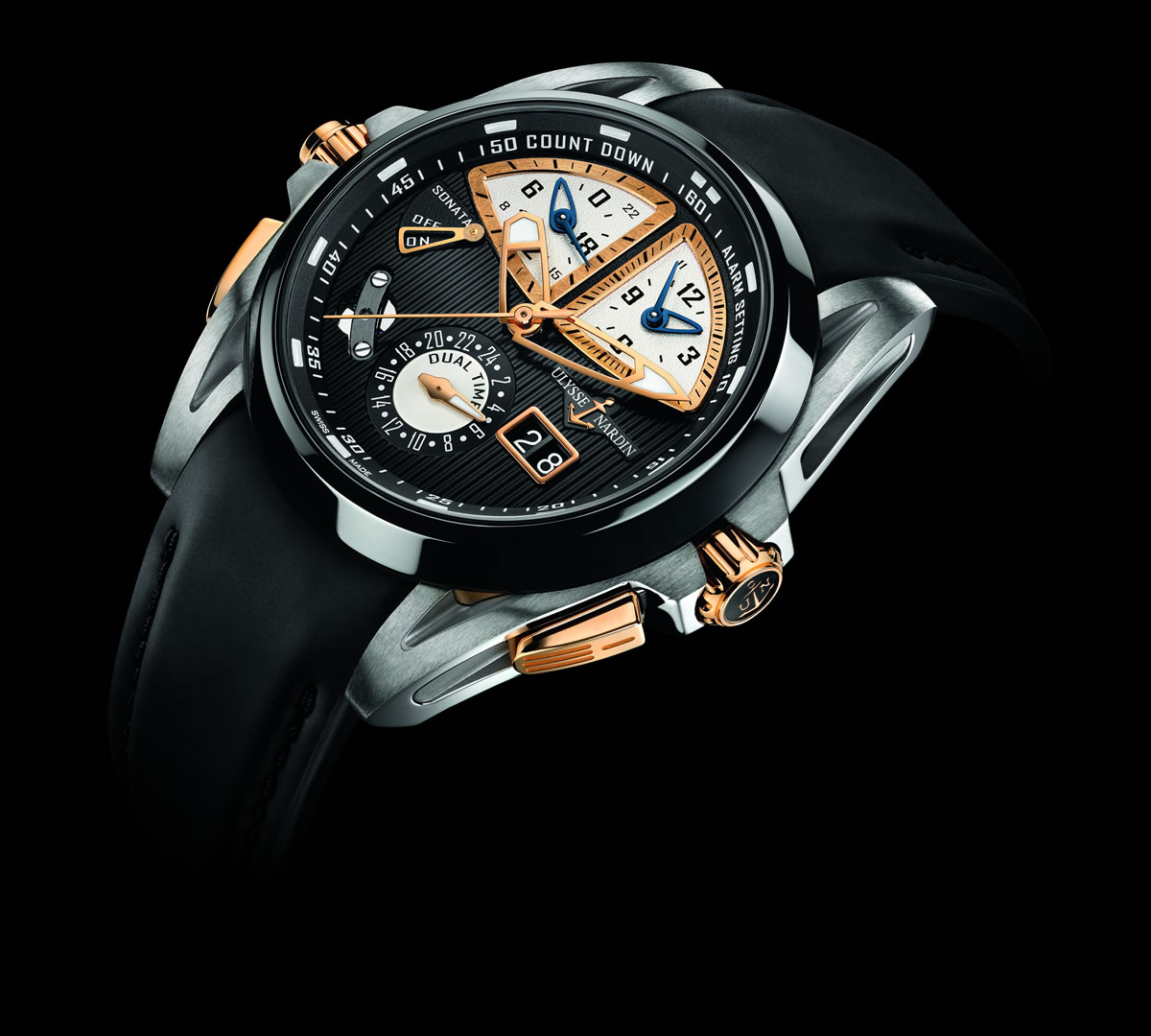 - Titanium case with rose gold elements and ceramic bezel.