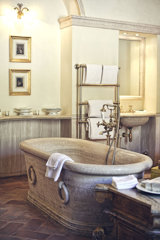 The suites themselves start on the next floor up – there are eight in total – and all are magnificent. Exhausted from our day of travel, we decided to forego a nighttime stroll of the property and head straight to our room. A soak in the marble tub, a few glasses of wine, and our day of travel was already forgotten. Before bed, however, I opened the doors to the Romeo and Juliet balcony, and although dark, I made out briefly what appeared to be a large canine figure running across the grounds. “Someone’s pet dog? Possibly a wolf? This is the country after all, although I’m not sure wolves are native to central Italy” I thought.