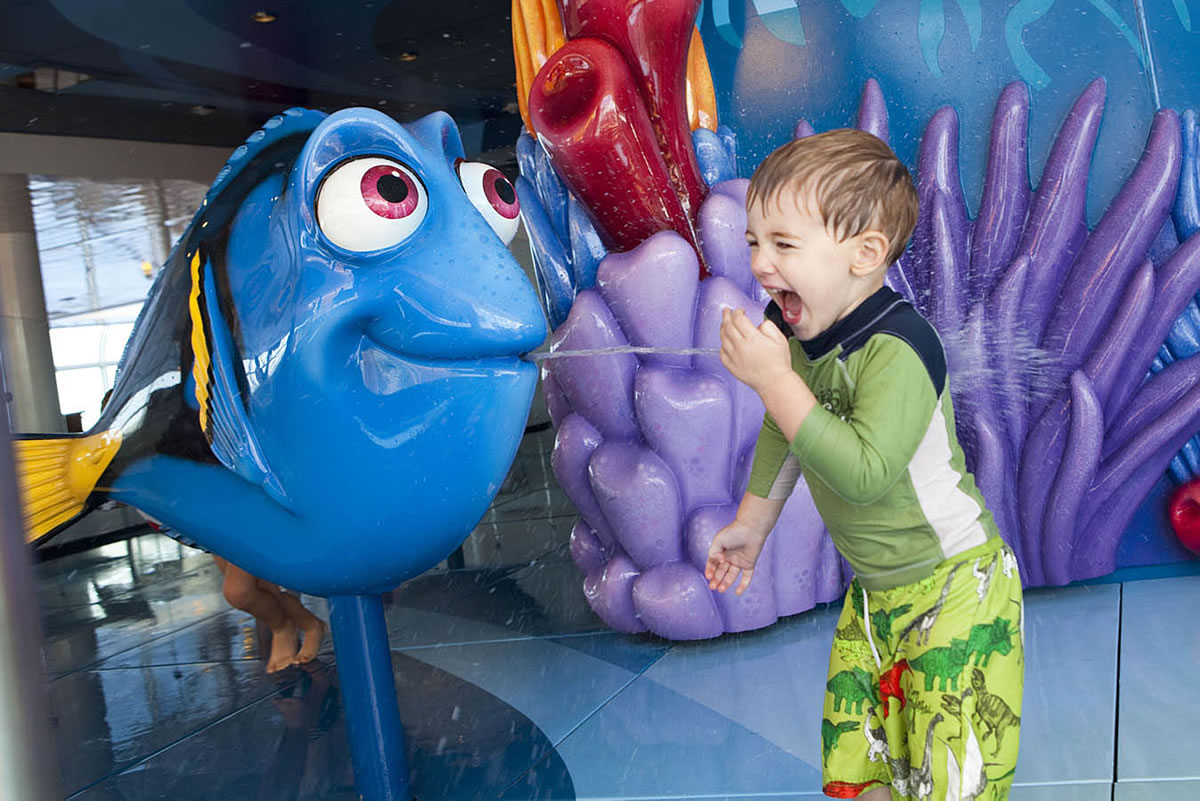 When you’re in the mood to get wet on the Disney Dream, you’ve got plenty of options. For the whole family, there’s Donald’s pool, with an approximately 5 foot depth and plenty of lounge chairs to take in some sun. Close to Donald’s Pool is Mickey’s Pool, which notes a 2 foot depth and is perfect for smaller children. And for new walkers, there’s Nemo’s Reef, an enclosed water play area featuring a variety of fountains, jets and bubblers in a unique Finding Nemo setting.