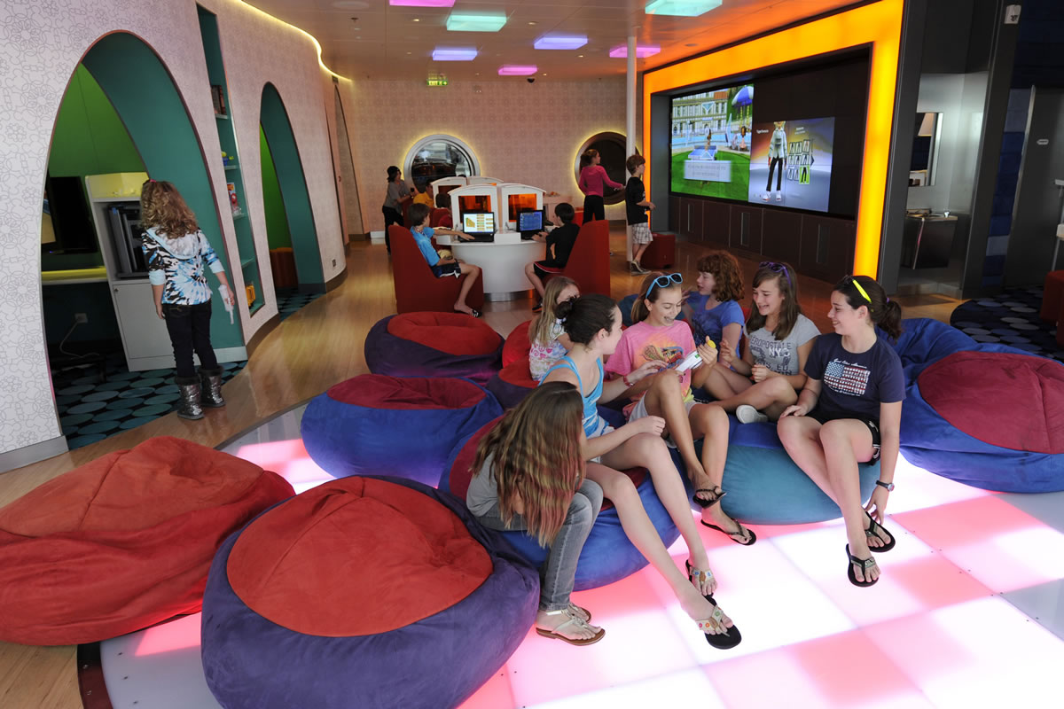 And finally, for those of you with pre-teens or teens, there are two sophisticated spaces for your kids: Edge and Vibe. Edge is a loft-style lounge exclusive to kids ages 11-14, with highlights including an illuminated dance floor, notebook computers that allow kids to play games and access a unique onboard social media application, and a state-of-the-art video wall that stretches more than 18 feet long and nearly 5 feet tall.